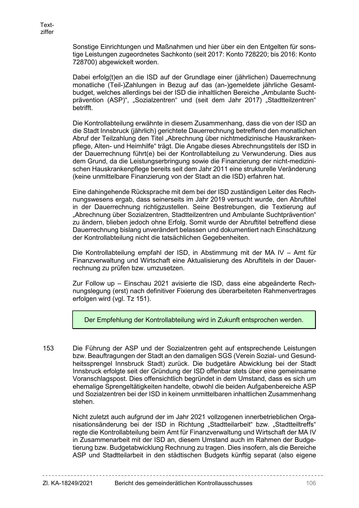 Zur Follow up – Einschau 2021 avisierte die ISD, dass eine abgeänderte Rechnungslegung (erst) nach definitiver Fixierung des überarbeiteten Rahmenvertrages