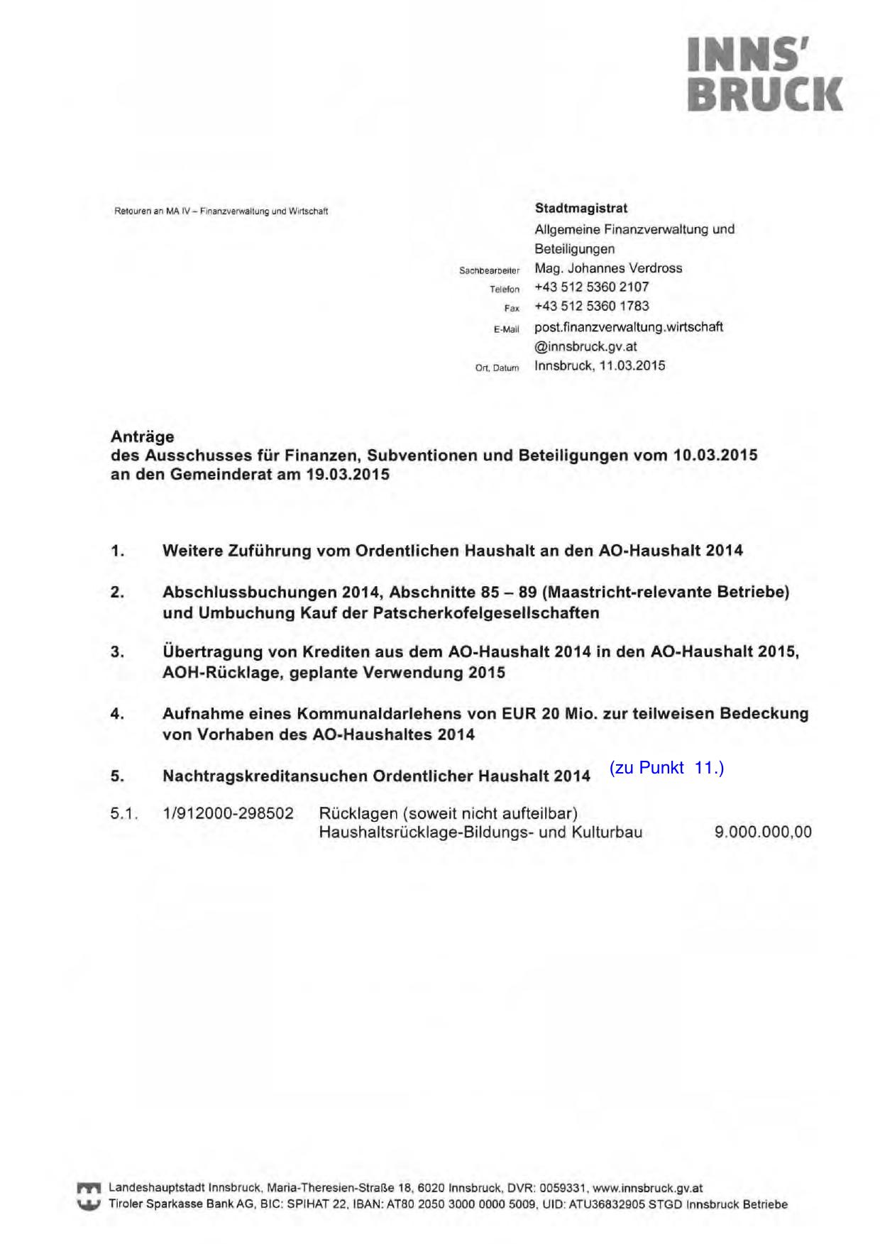 Nachtragskreditansuchen Ordentlicher Haushalt 2014