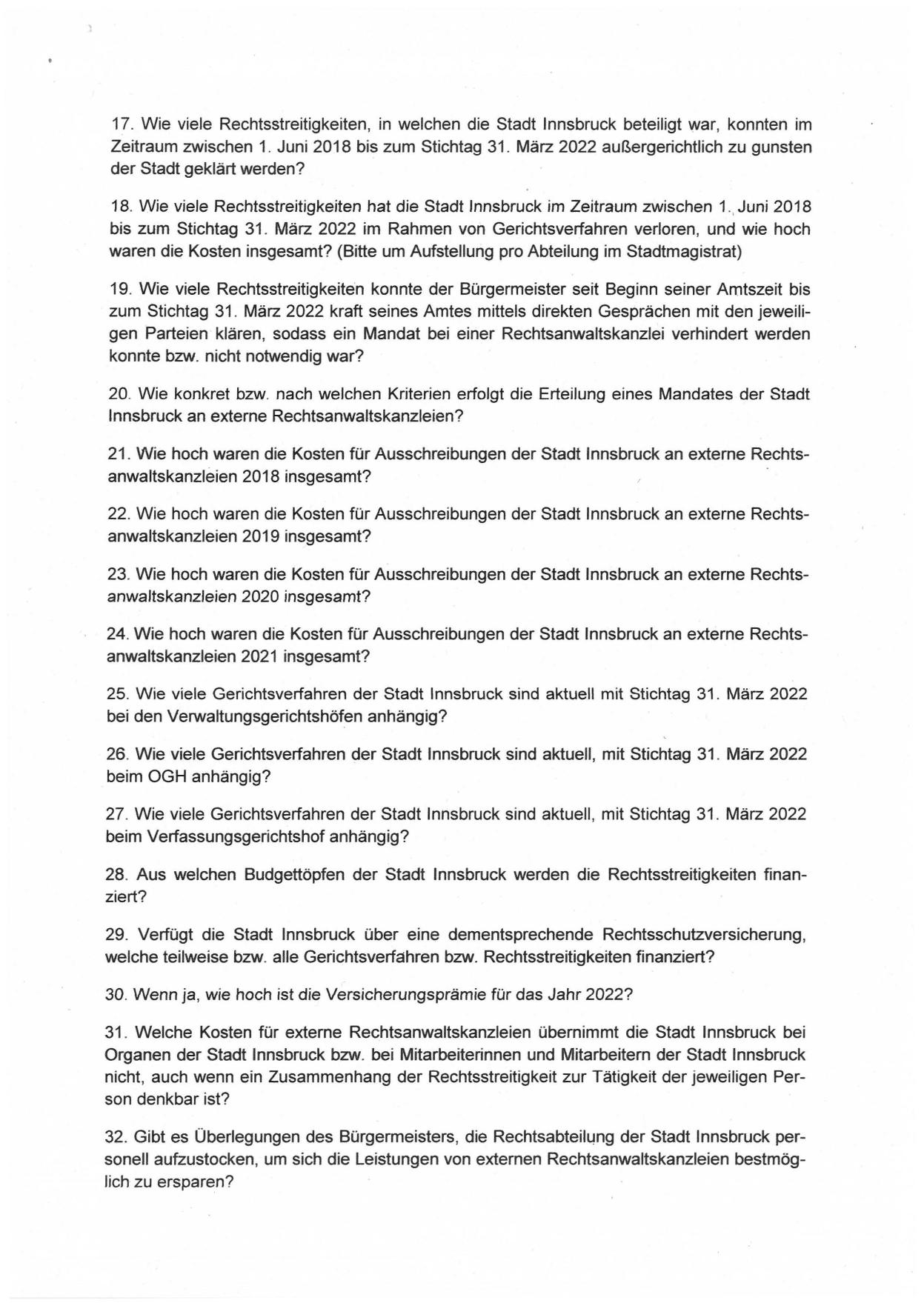 32. Gibt es Überlegungen des Bürgermeisters, die RechtsabteilLJng der Stadt Innsbruck personell aufzustocken, um sich die Leistungen von externen Rechtsanwaltskanzleien bestmöglich zu ersparen?