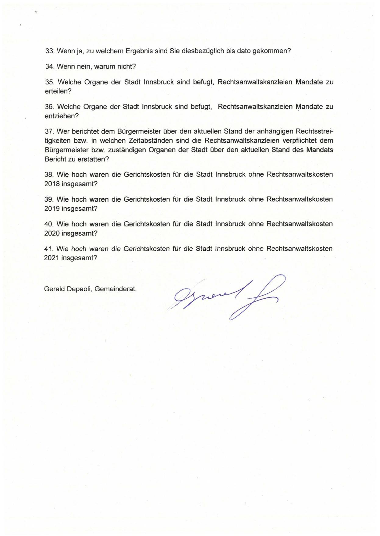 38. Wie hoch waren die Gerichtskosten für die Stadt Innsbruck ohne Rechtsanwaltskosten