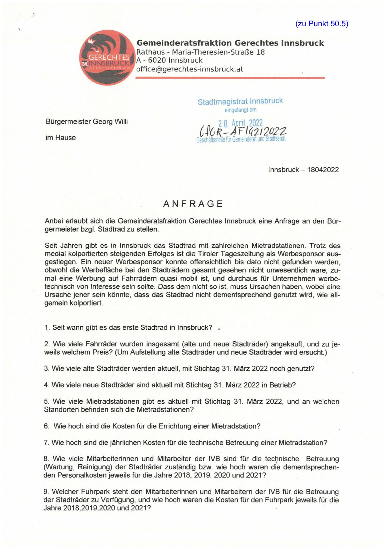 Anbei erlaubt sich die Gemeinderatsfraktion Gerechtes Innsbruck eine Anfrage an den Bürgermeister bzgl. Stadtrad zu stellen.