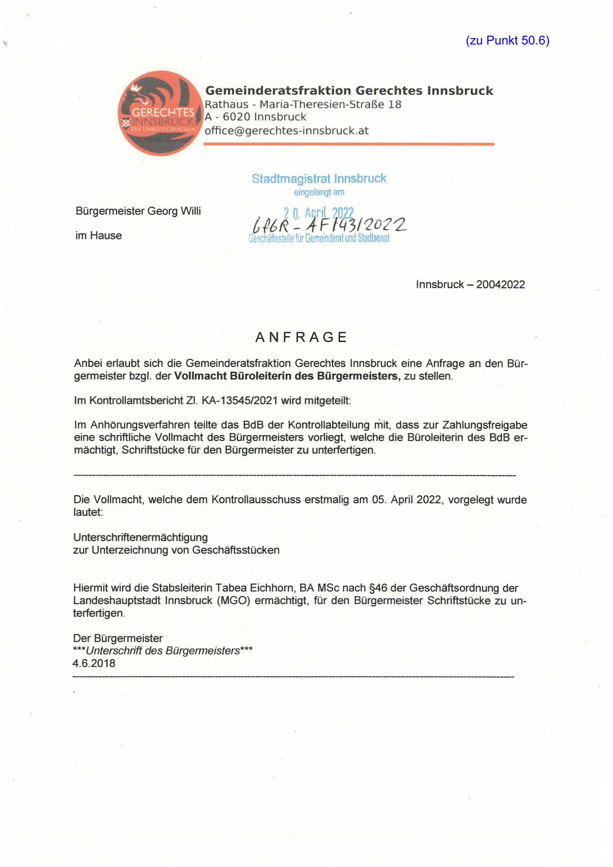 Anbei erlaubt sich die Gemeinderatsfraktion Gerechtes Innsbruck eine Anfrage an den Bürgermeister bzgl. der Vollmacht Büroleiterin des Bürgermeisters, zu stellen.