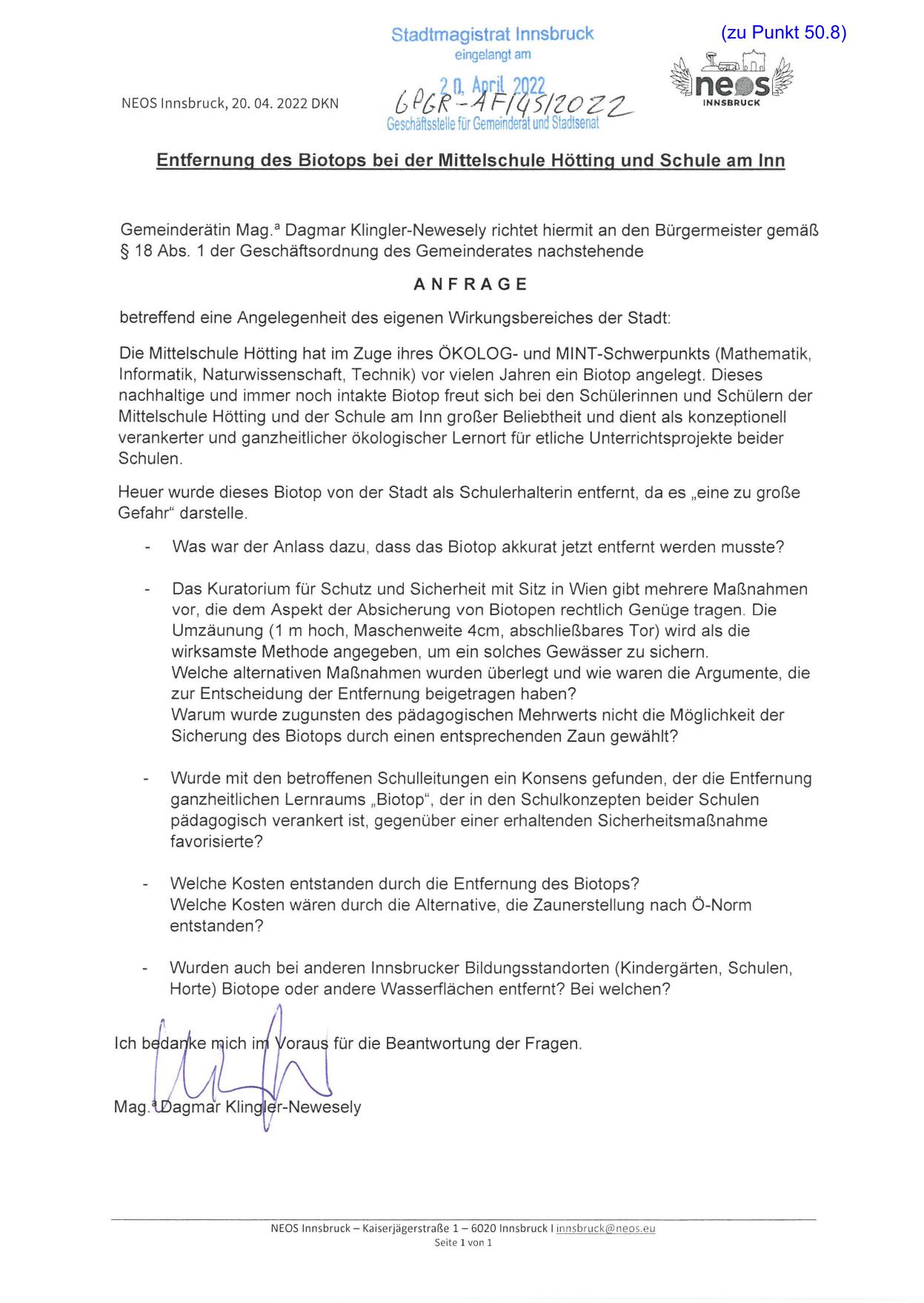 Gemeinderätin Mag .a Dagmar Klingler-Newesely richtet hiermit an den Bürgermeister gemäß