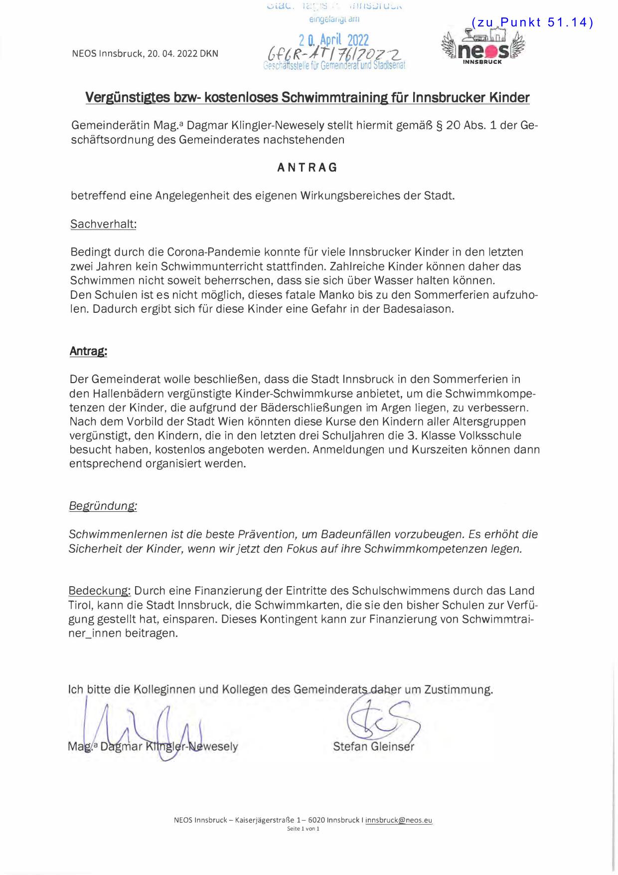 Der G e m e i n d e rat wo l l e besc h l ieße n , dass d i e Sta dt I n nsbruck i n den Som m e rferien i n