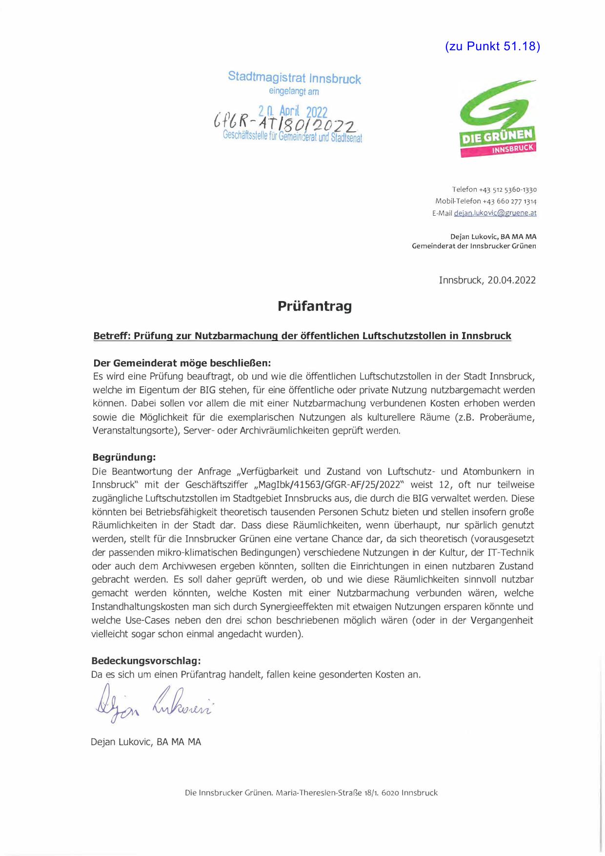 Betreff: Prüfu ng zur N utzba rmachung der öffentl ichen Luftsch utzstol len i n I n n sbruck
