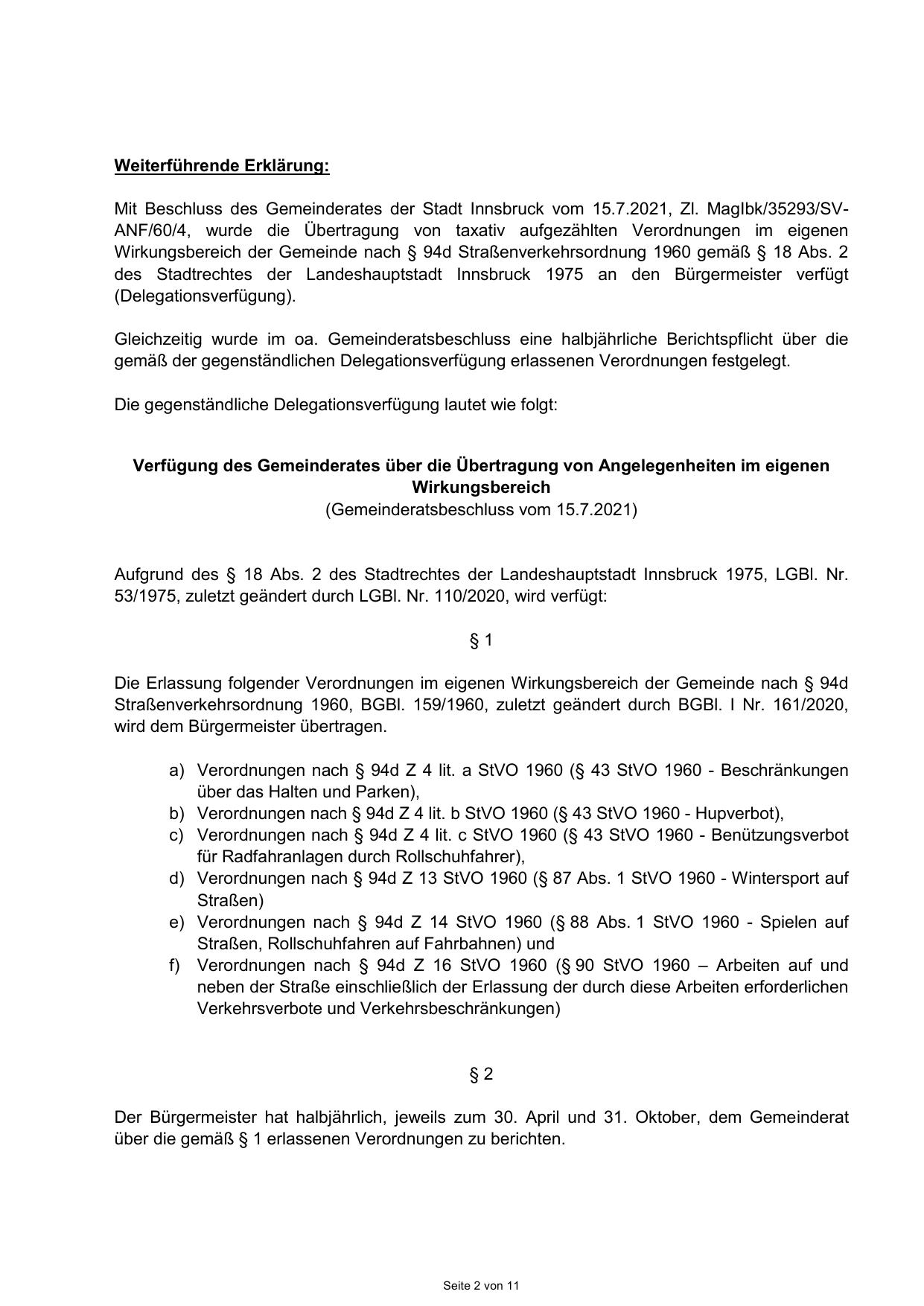 Mit Beschluss des Gemeinderates der Stadt Innsbruck vom 15.7.2021, Zl. MagIbk/35293/SVANF/60/4, wurde die Übertragung von taxativ aufgezählten Verordnungen im eigenen