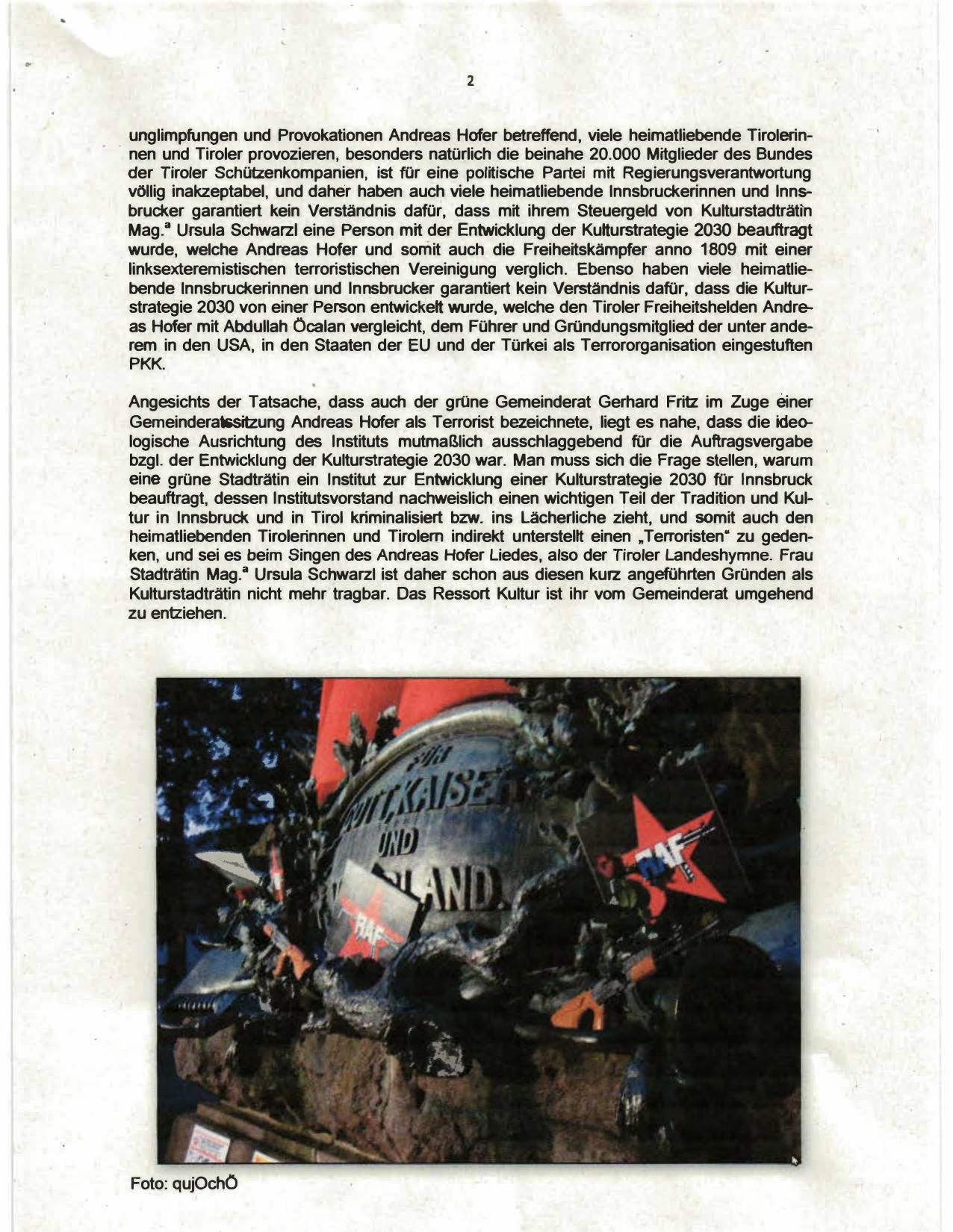 heimatliebenden Tirolerinnen und Tirolern indirekt unterstellt einen "Terroristen" zu geden­