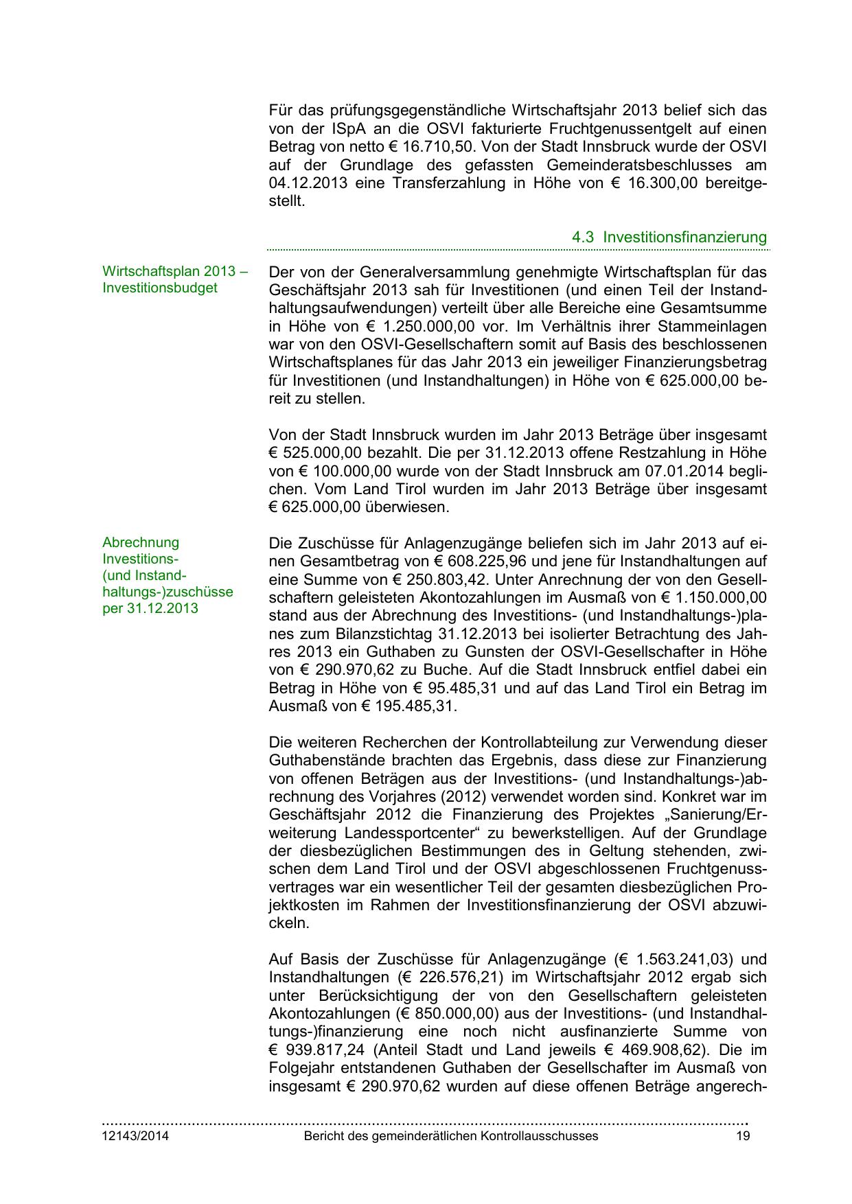 von € 100.000,00 wurde von der Stadt Innsbruck am 07.01.2014 beglichen. Vom Land Tirol wurden im Jahr 2013 Beträge über insgesamt