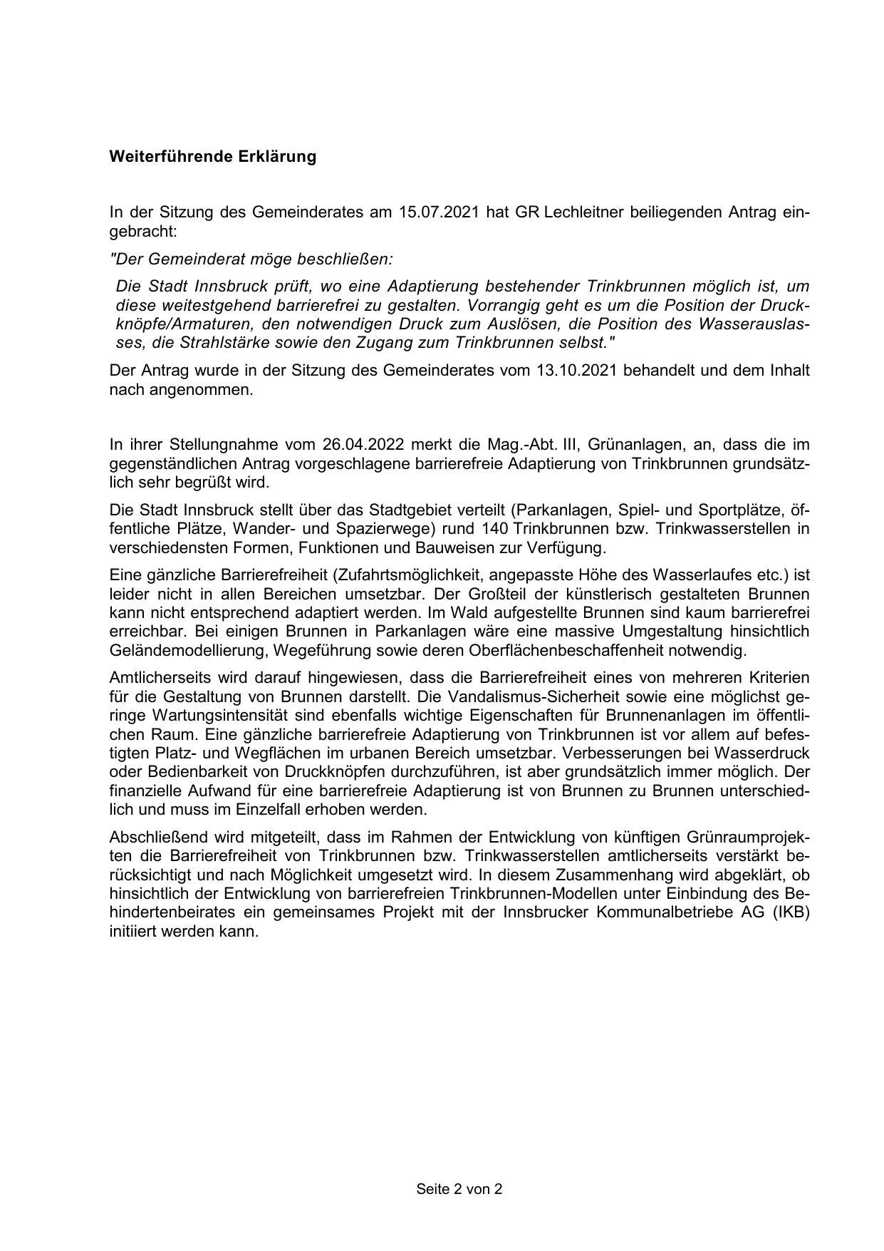 Abschließend wird mitgeteilt, dass im Rahmen der Entwicklung von künftigen Grünraumprojekten die Barrierefreiheit von Trinkbrunnen bzw. Trinkwasserstellen amtlicherseits verstärkt berücksichtigt und nach Möglichkeit umgesetzt wird. In diesem Zusammenhang wird abgeklärt, ob