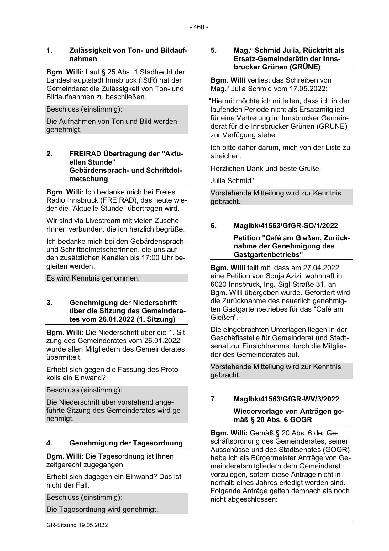 Bgm. Willi: Gemäß § 20 Abs. 6 der Geschäftsordnung des Gemeinderates, seiner