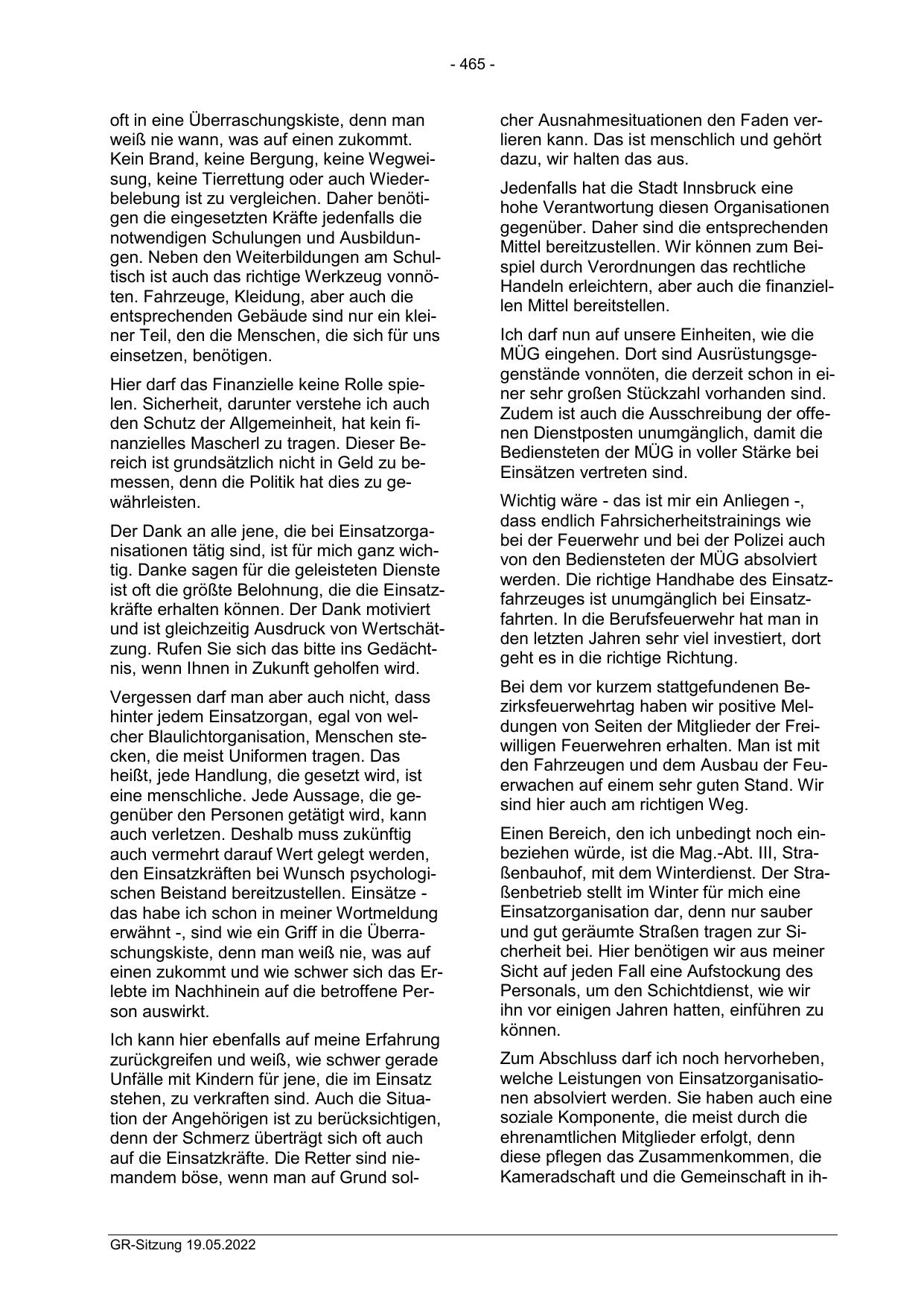 den Schutz der Allgemeinheit, hat kein finanzielles Mascherl zu tragen. Dieser Bereich ist grundsätzlich nicht in Geld zu bemessen, denn die Politik hat dies zu gewährleisten.