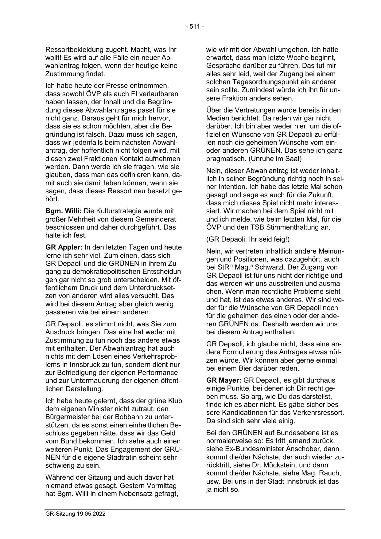 darüber. Ich bin aber weder hier, um die offiziellen Wünsche von GR Depaoli zu erfüllen noch die geheimen Wünsche vom einoder anderen GRÜNEN. Das sehe ich ganz