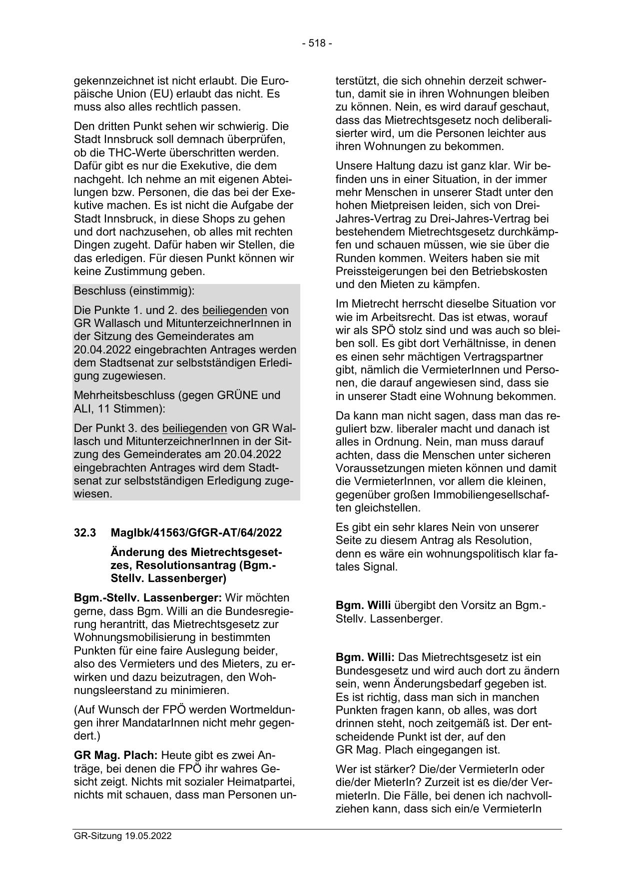 Änderung des Mietrechtsgesetzes, Resolutionsantrag (Bgm.Stellv. Lassenberger)