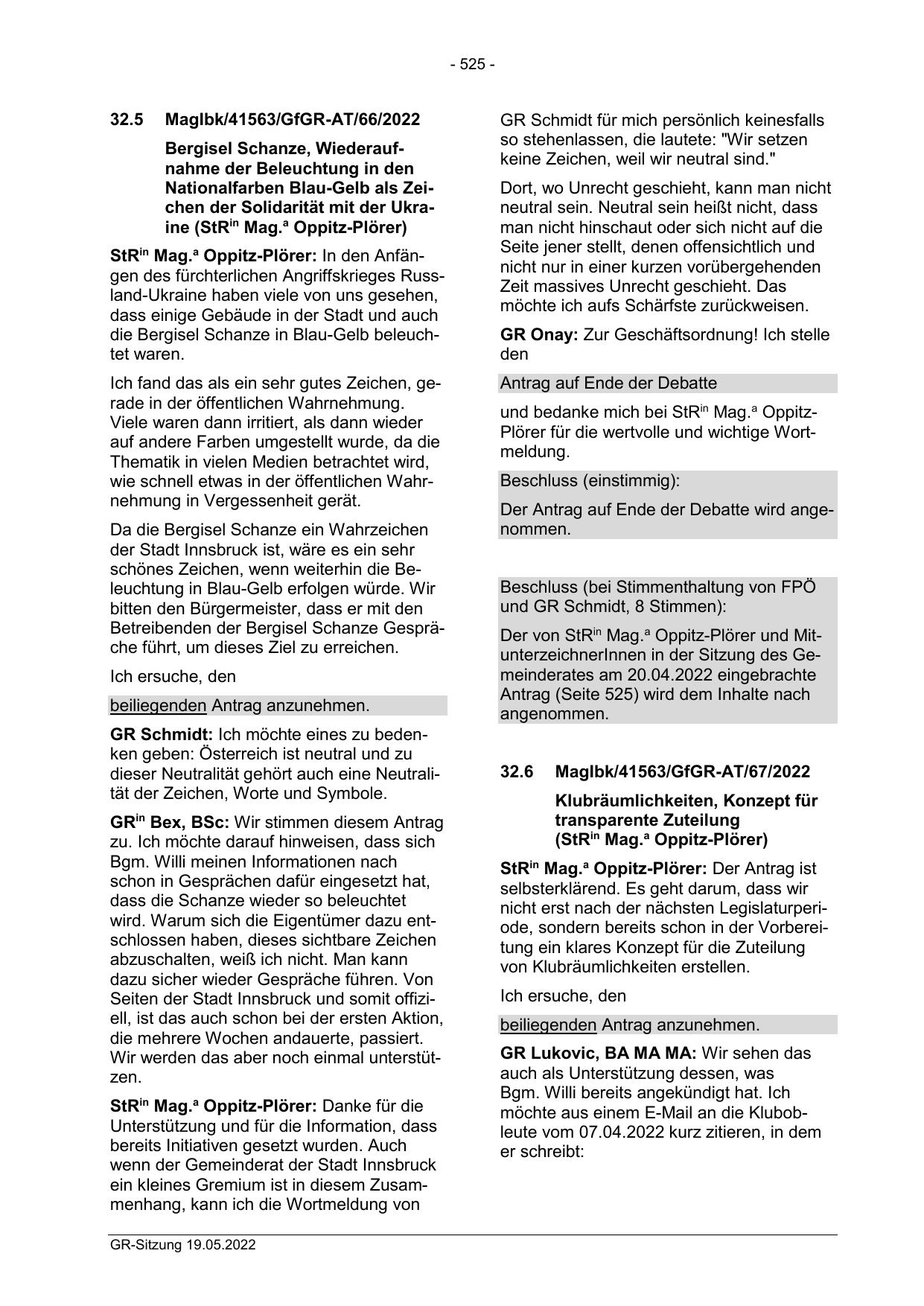 Der von StRin Mag.a Oppitz-Plörer und MitunterzeichnerInnen in der Sitzung des Gemeinderates am 20.04.2022 eingebrachte