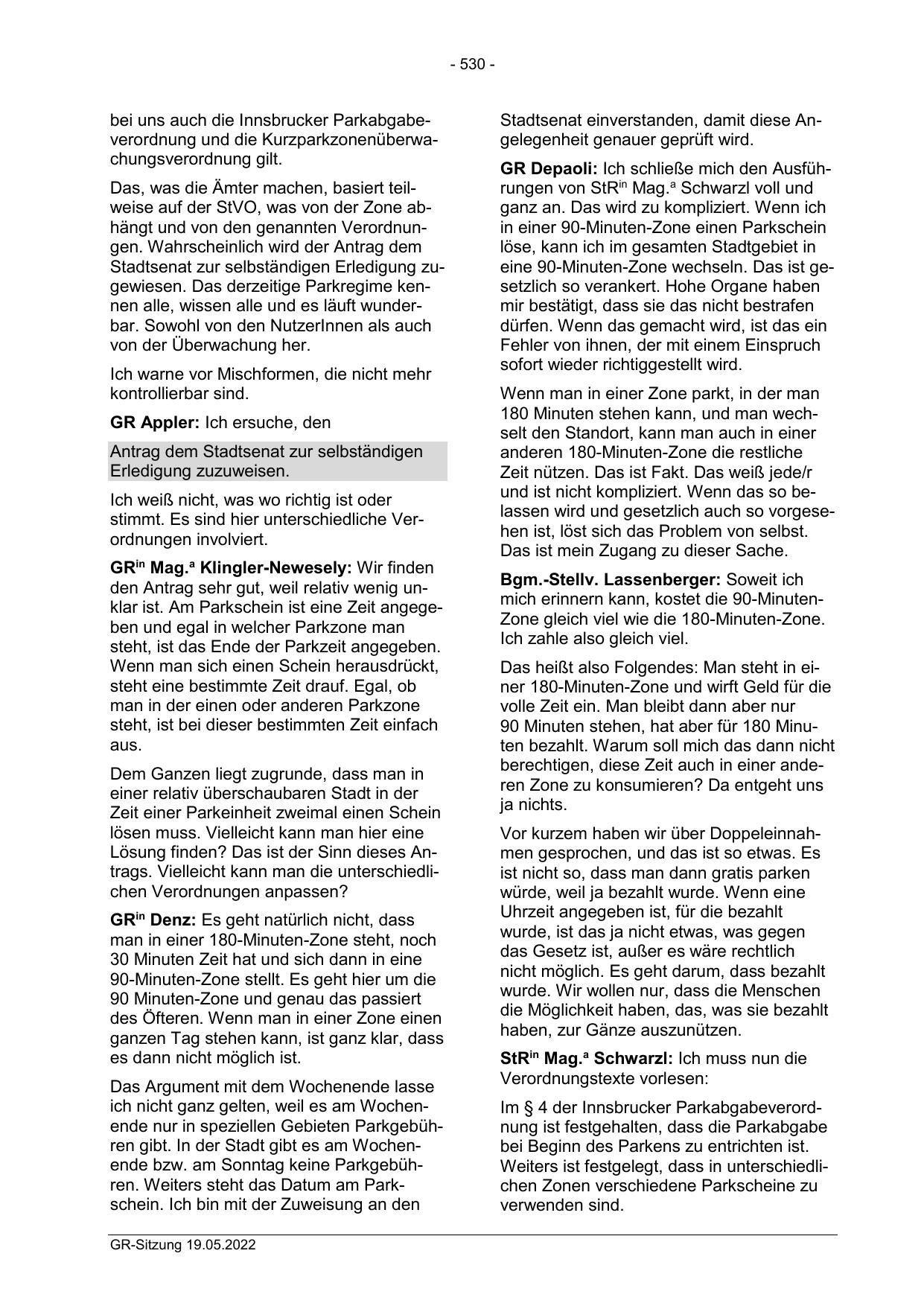 Stadtsenat zur selbständigen Erledigung zugewiesen. Das derzeitige Parkregime kennen alle, wissen alle und es läuft wunderbar. Sowohl von den NutzerInnen als auch
