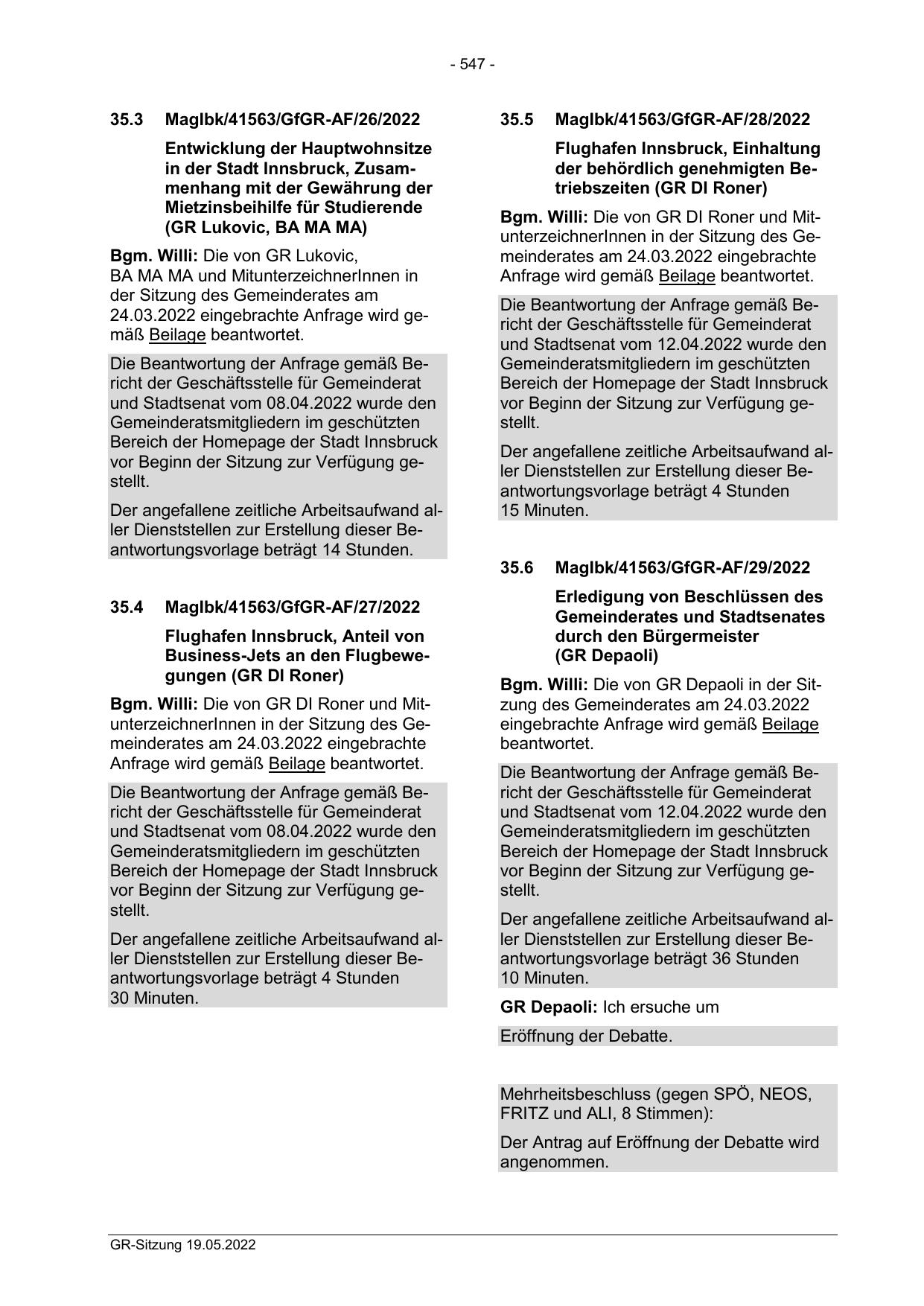 Bgm. Willi: Die von GR DI Roner und MitunterzeichnerInnen in der Sitzung des Gemeinderates am 24.03.2022 eingebrachte