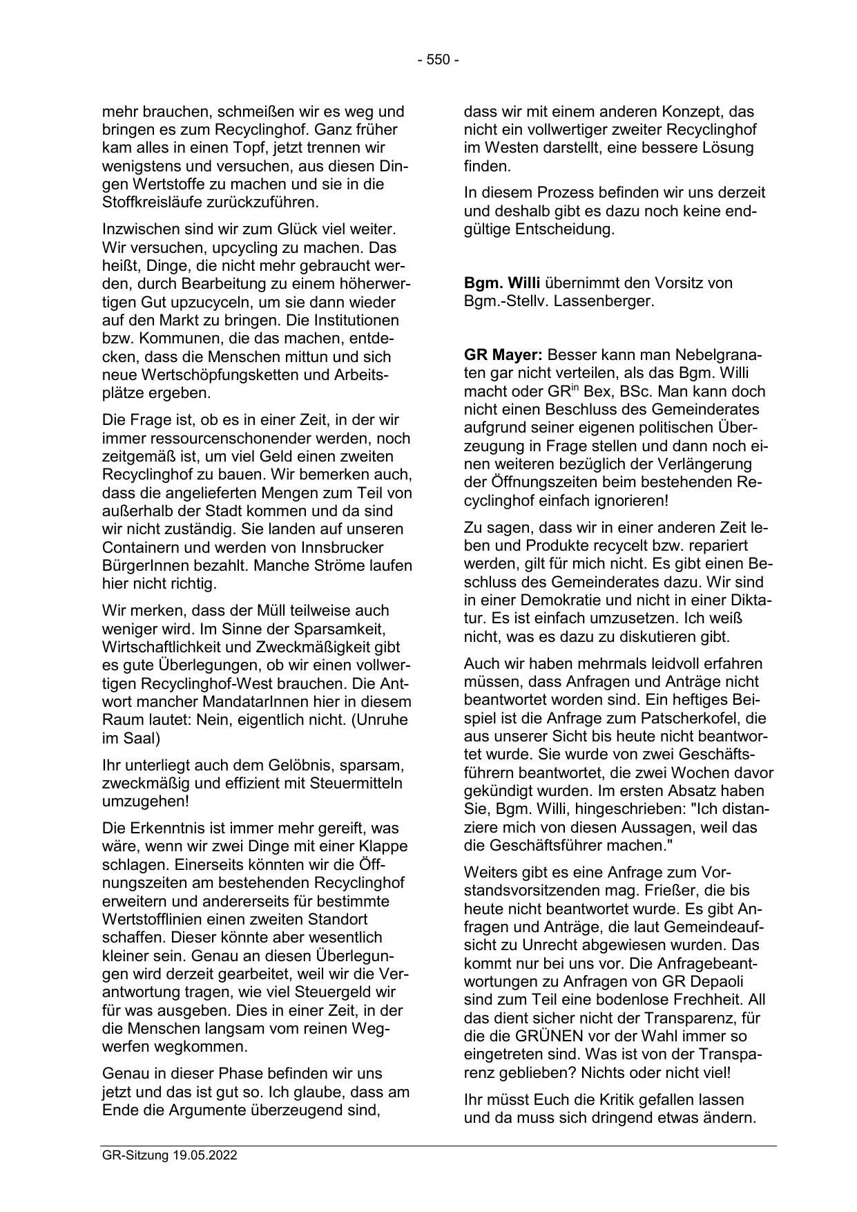 es gute Überlegungen, ob wir einen vollwertigen Recyclinghof-West brauchen. Die Antwort mancher MandatarInnen hier in diesem