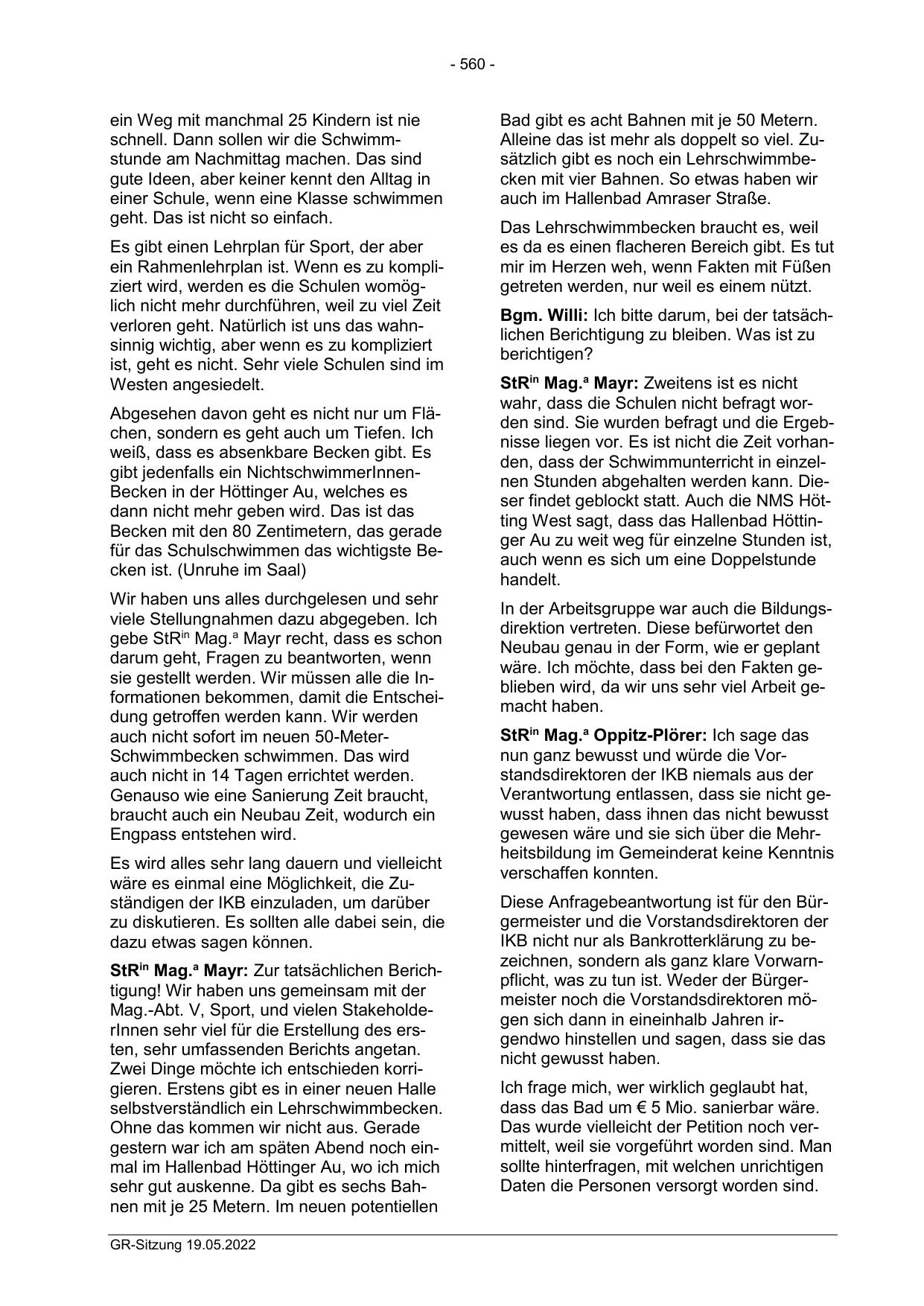 wahr, dass die Schulen nicht befragt worden sind. Sie wurden befragt und die Ergebnisse liegen vor. Es ist nicht die Zeit vorhanden, dass der Schwimmunterricht in einzelnen Stunden abgehalten werden kann. Dieser findet geblockt statt. Auch die NMS Hötting West sagt, dass das Hallenbad Höttinger Au zu weit weg für einzelne Stunden ist,