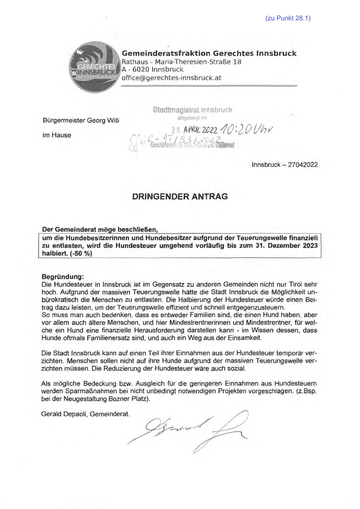 hoch. Aufgrund der massiven Teuerungswelle hätte die Stadt Innsbruck die Möglichkeit unbürokratisch die Menschen .zu entlasten. Die Halbierung der Hundesteuer würde einen Beitrag dazu leisten, um der Teuerungswelle effizient und schnell entgegenzusteuern.