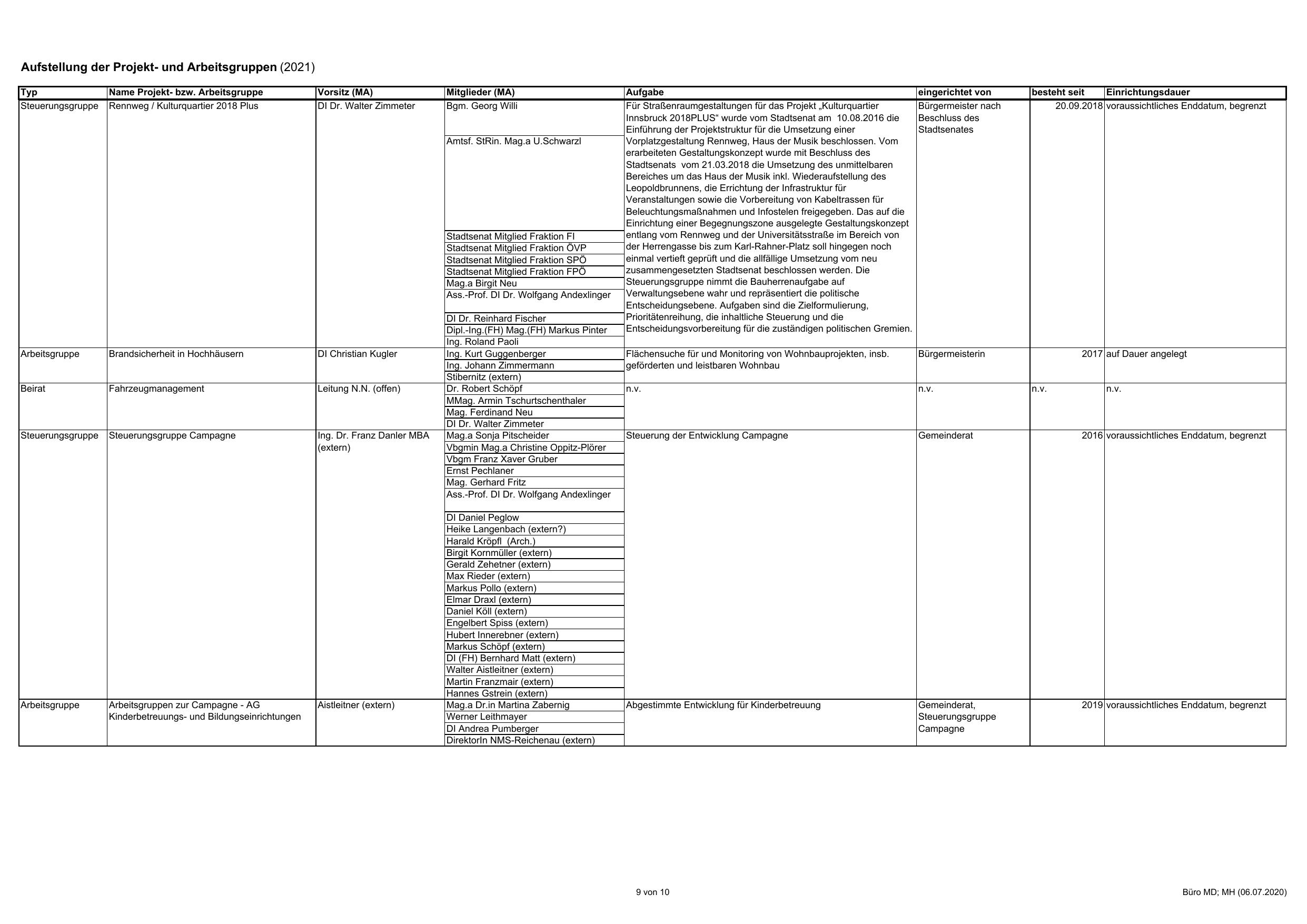 Aufstellung der Projekt- und Arbeitsgruppen (2021)