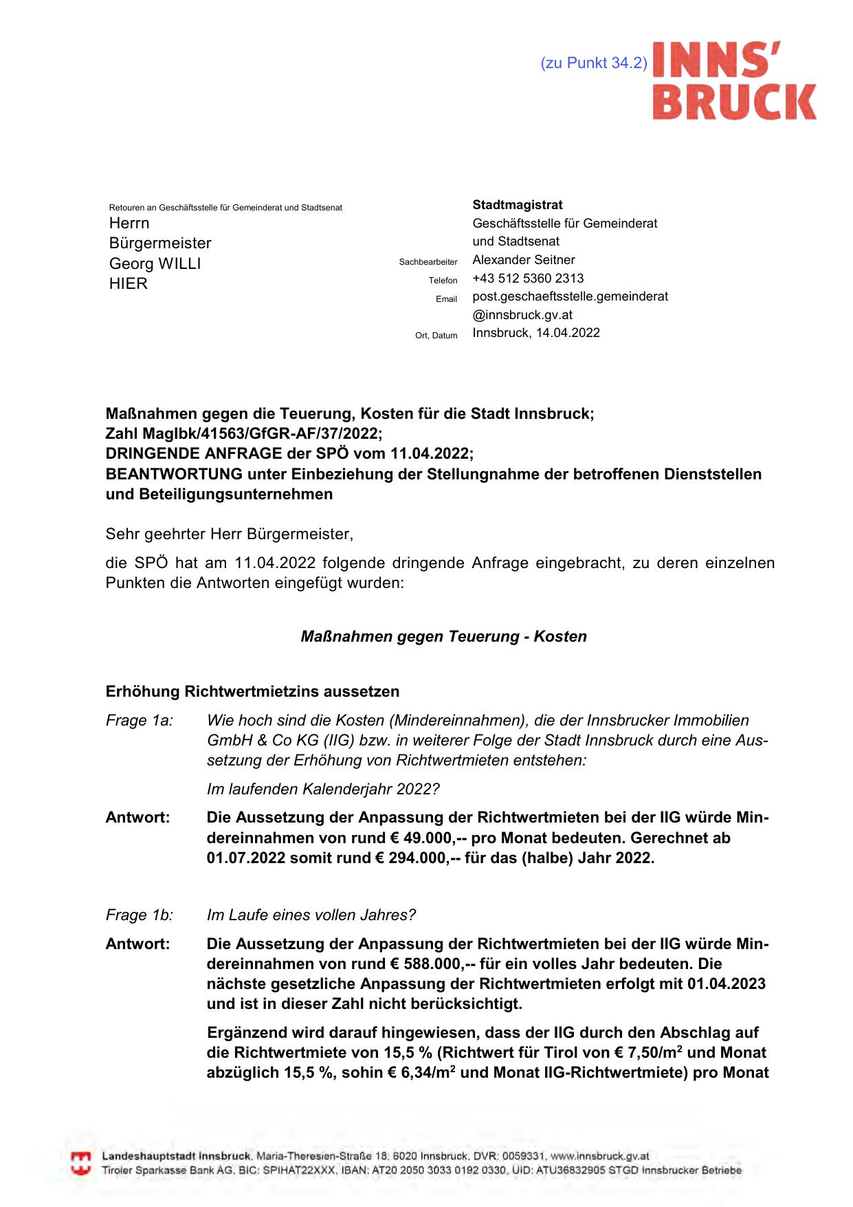 GmbH & Co KG (IIG) bzw. in weiterer Folge der Stadt Innsbruck durch eine Aussetzung der Erhöhung von Richtwertmieten entstehen: