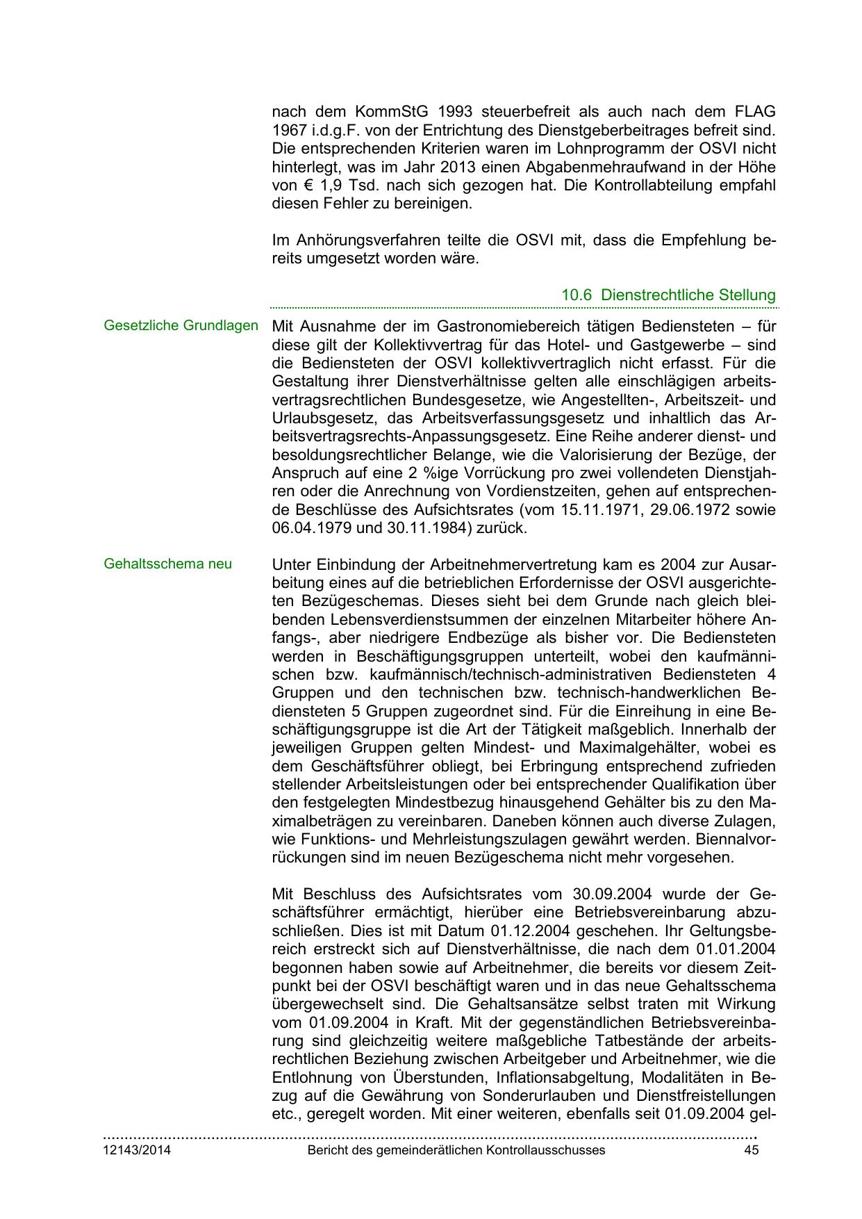 Unter Einbindung der Arbeitnehmervertretung kam es 2004 zur Ausarbeitung eines auf die betrieblichen Erfordernisse der OSVI ausgerichteten Bezügeschemas. Dieses sieht bei dem Grunde nach gleich bleibenden Lebensverdienstsummen der einzelnen Mitarbeiter höhere Anfangs-, aber niedrigere Endbezüge als bisher vor. Die Bediensteten
