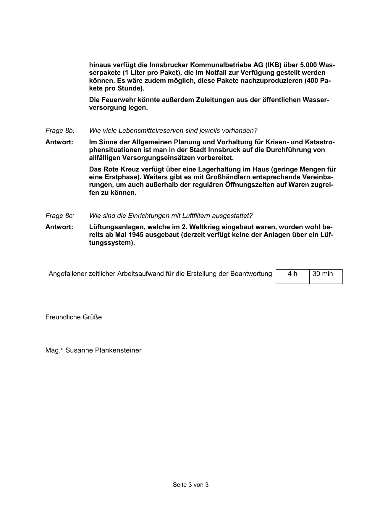 Angefallener zeitlicher Arbeitsaufwand für die Erstellung der Beantwortung