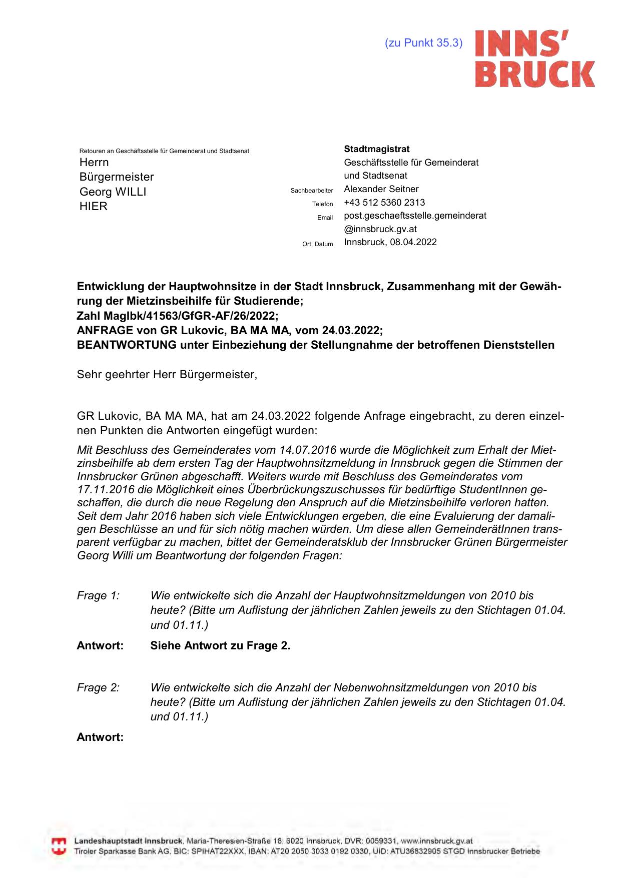 GR Lukovic, BA MA MA, hat am 24.03.2022 folgende Anfrage eingebracht, zu deren einzelnen Punkten die Antworten eingefügt wurden: