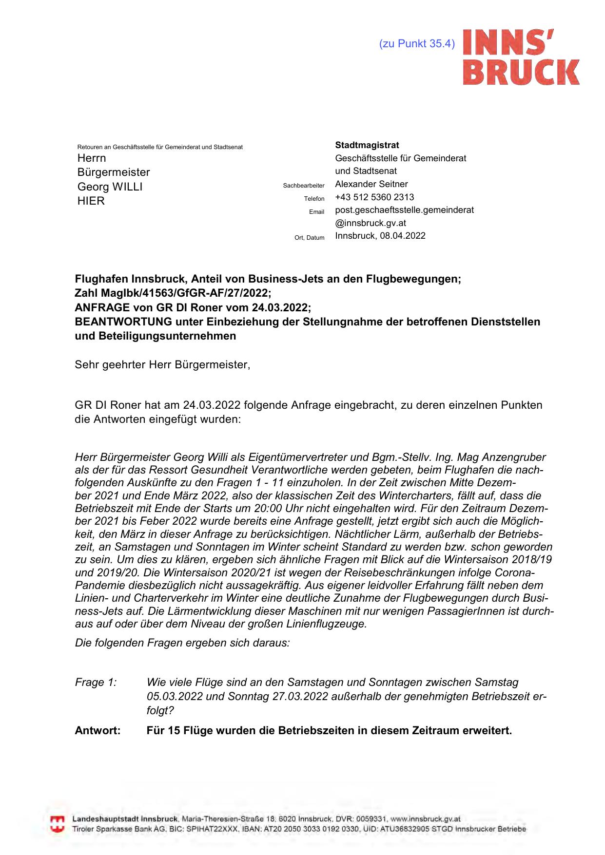 GR DI Roner hat am 24.03.2022 folgende Anfrage eingebracht, zu deren einzelnen Punkten