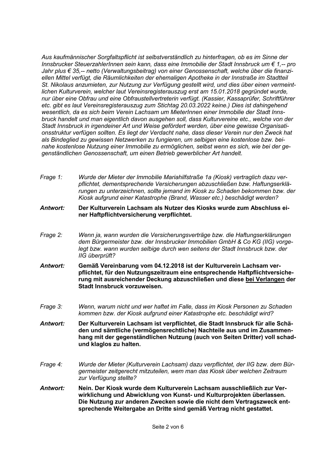 wesentlich, da es sich beim Verein Lachsam um MieterInnen einer Immobilie der Stadt Innsbruck handelt und man eigentlich davon ausgehen soll, dass Kulturvereine etc., welche von der
