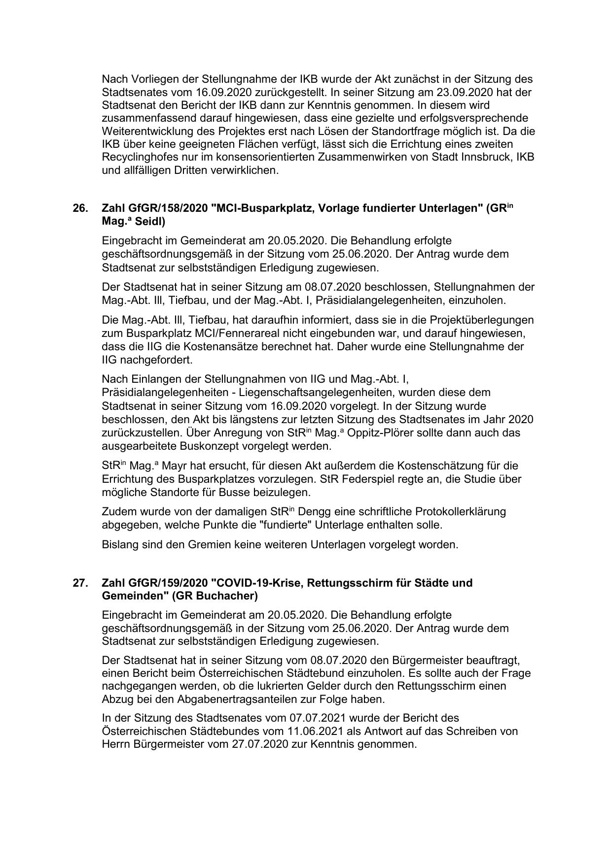 Zahl GfGR/158/2020 "MCI-Busparkplatz, Vorlage fundierter Unterlagen" (GRin
