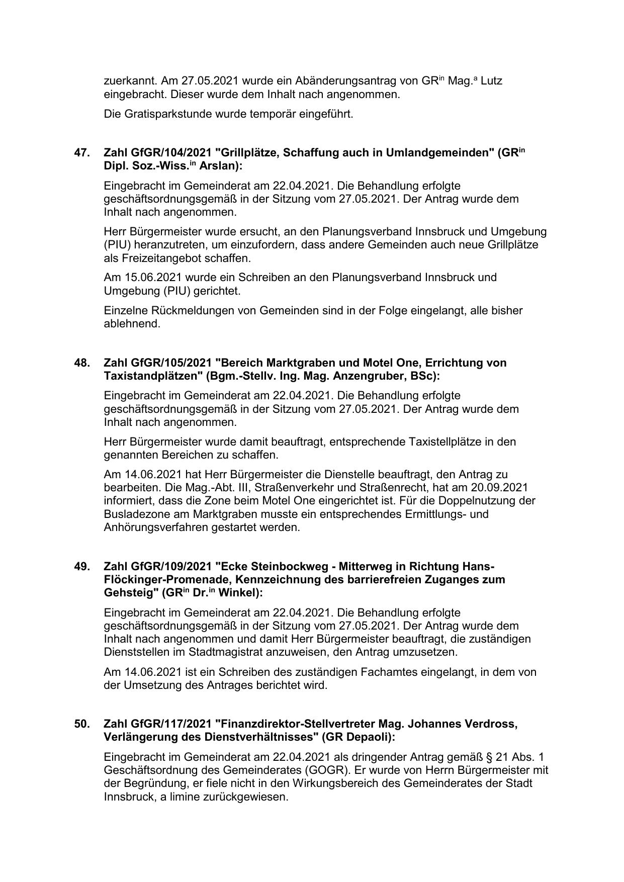 zuerkannt. Am 27.05.2021 wurde ein Abänderungsantrag von GRin Mag.a Lutz