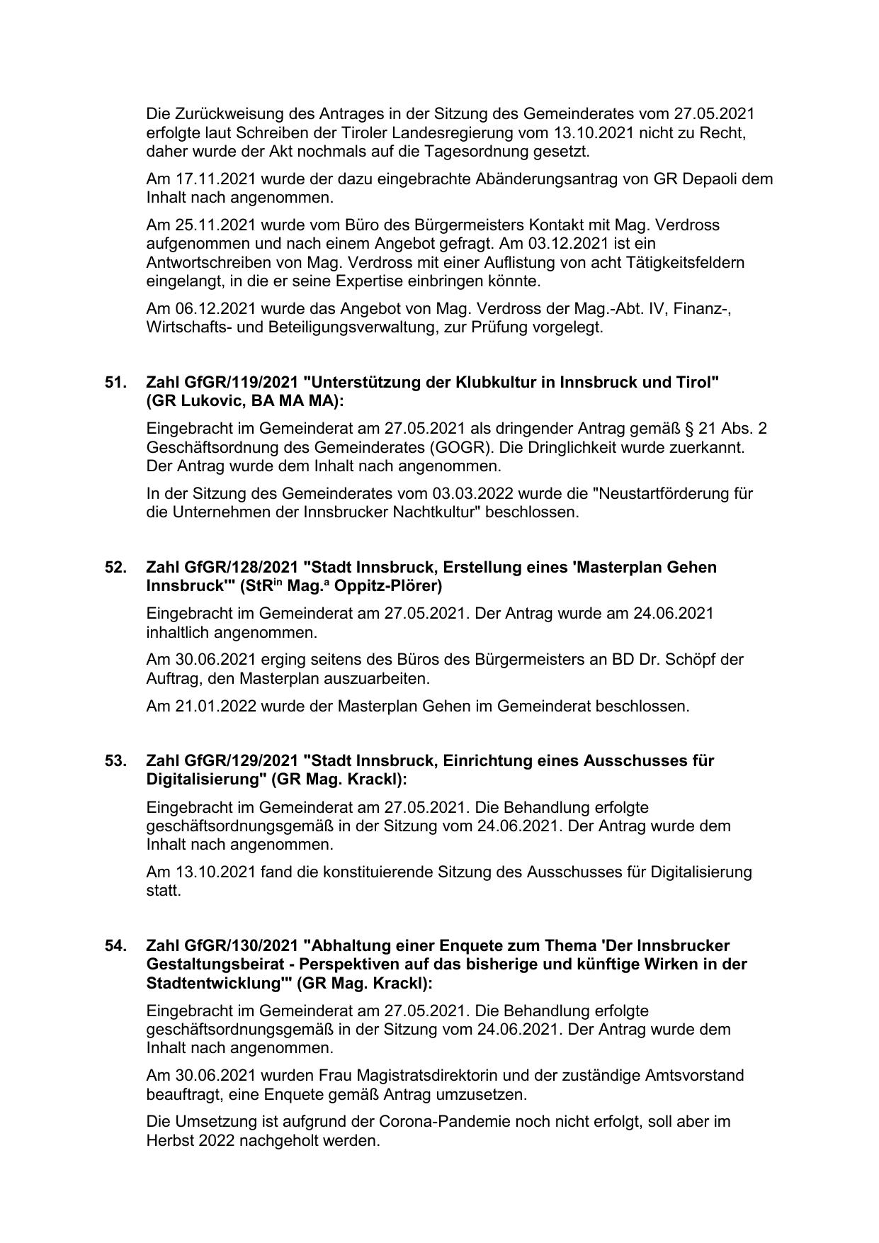 Zahl GfGR/130/2021 "Abhaltung einer Enquete zum Thema "Der Innsbrucker