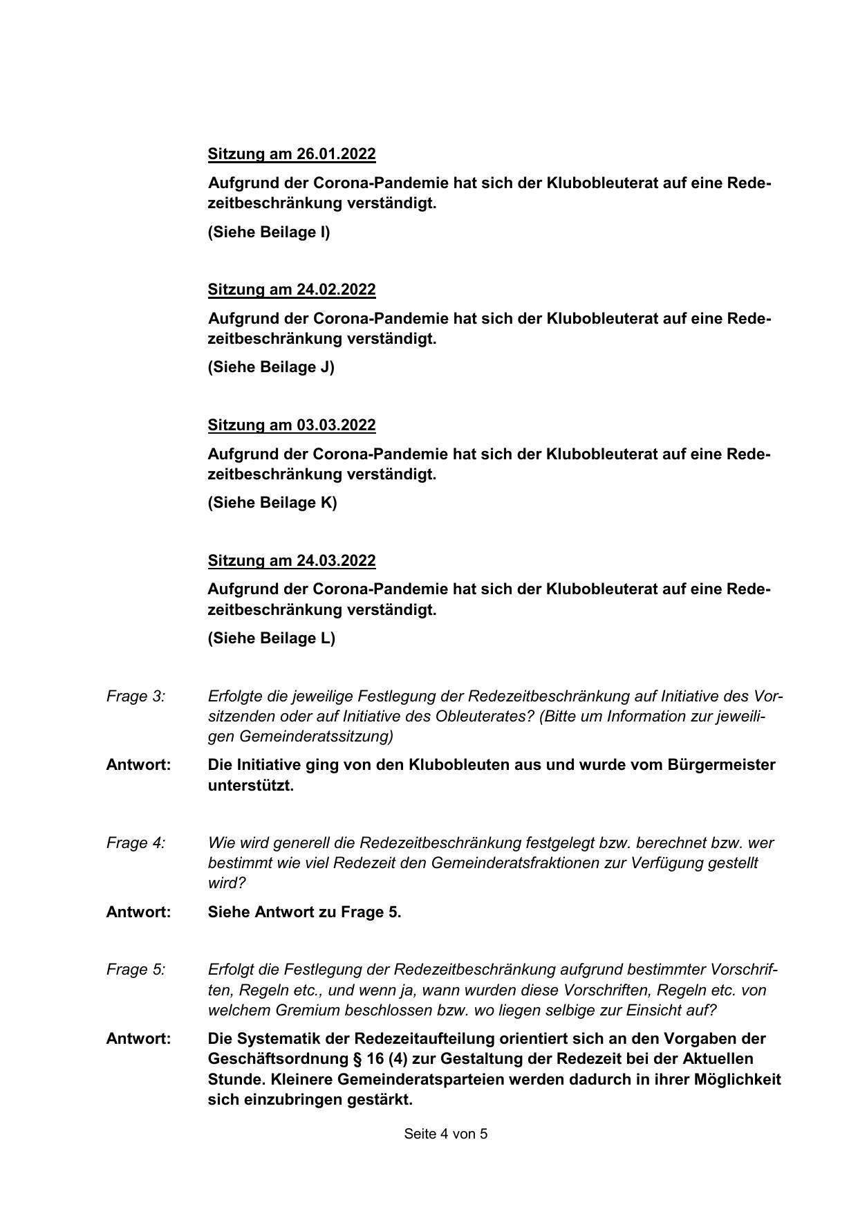 Erfolgte die jeweilige Festlegung der Redezeitbeschränkung auf Initiative des Vorsitzenden oder auf Initiative des Obleuterates? (Bitte um Information zur jeweiligen Gemeinderatssitzung)