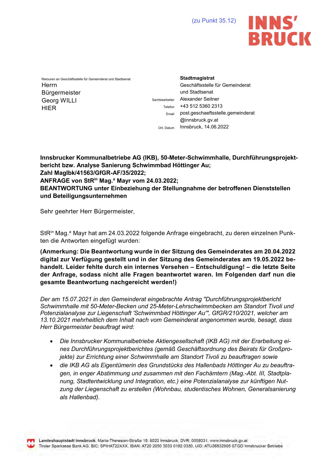 die IKB AG als Eigentümerin des Grundstücks des Hallenbads Höttinger Au zu beauftragen, in enger Abstimmung und zusammen mit den Fachämtern (Mag.-Abt. III, Stadtplanung, Stadtentwicklung und Integration, etc.) eine Potenzialanalyse zur künftigen Nutzung der Liegenschaft zu erstellen (Wohnbau, studentisches Wohnen, Generalsanierung