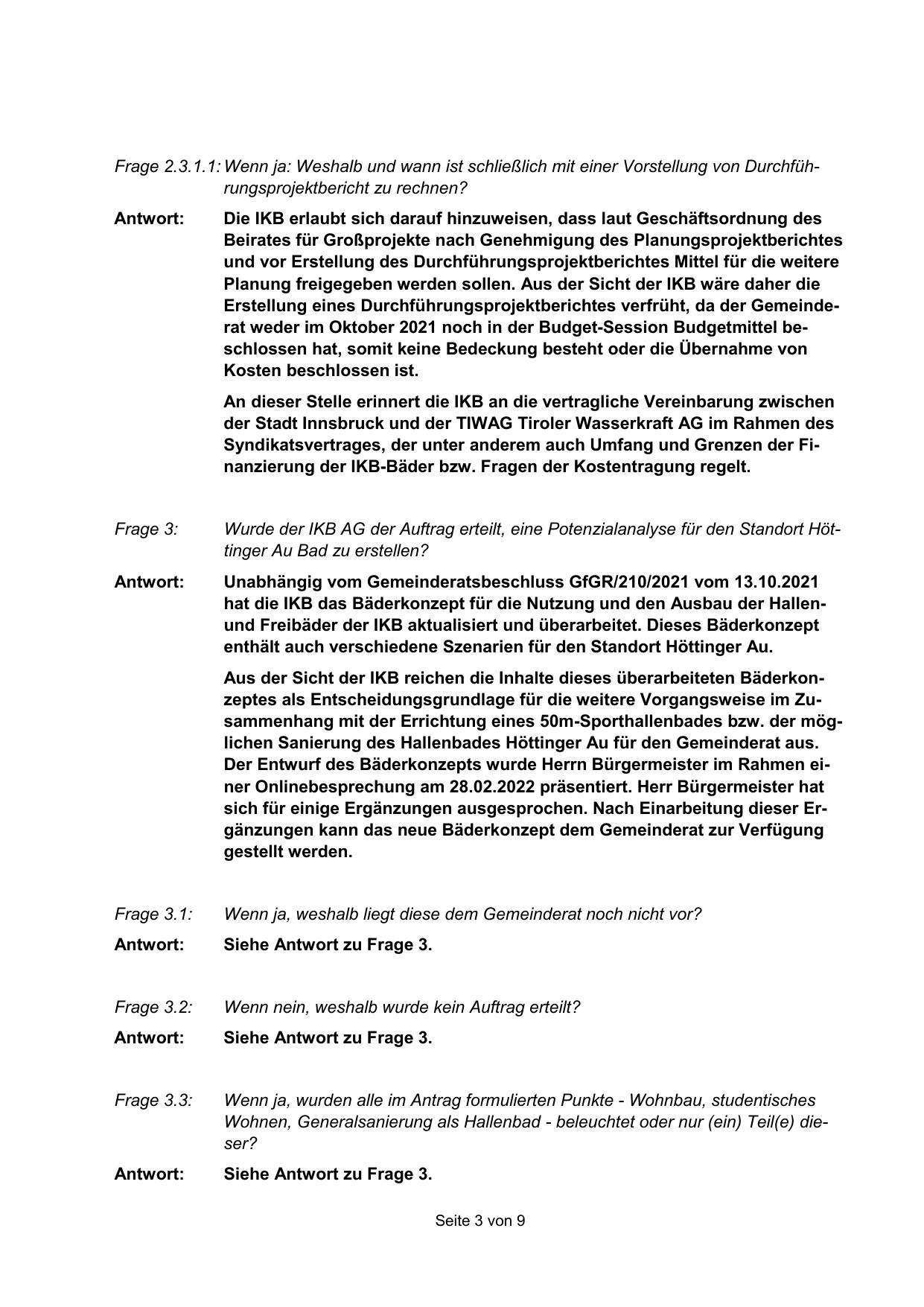 Aus der Sicht der IKB reichen die Inhalte dieses überarbeiteten Bäderkonzeptes als Entscheidungsgrundlage für die weitere Vorgangsweise im Zusammenhang mit der Errichtung eines 50m-Sporthallenbades bzw. der möglichen Sanierung des Hallenbades Höttinger Au für den Gemeinderat aus.