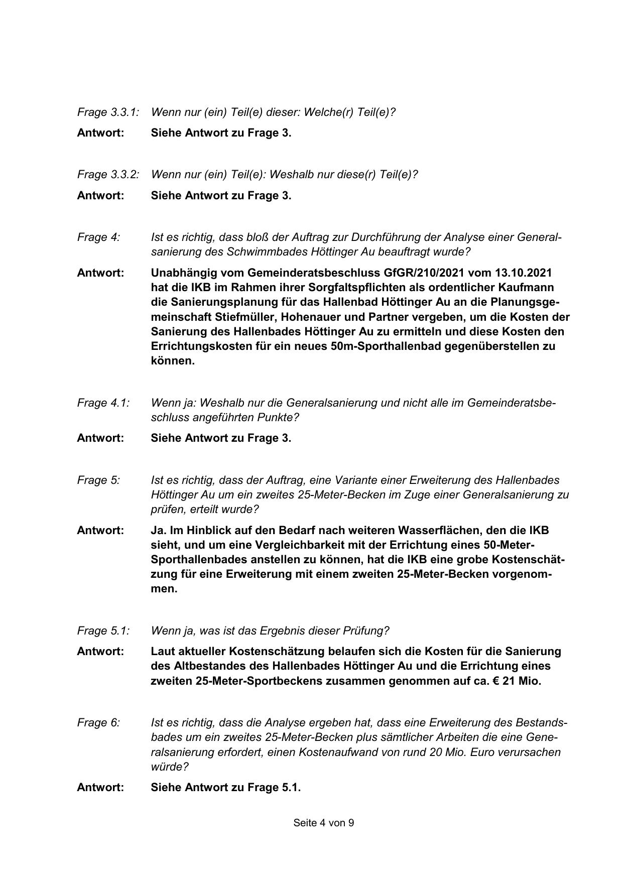 Ist es richtig, dass bloß der Auftrag zur Durchführung der Analyse einer Generalsanierung des Schwimmbades Höttinger Au beauftragt wurde?