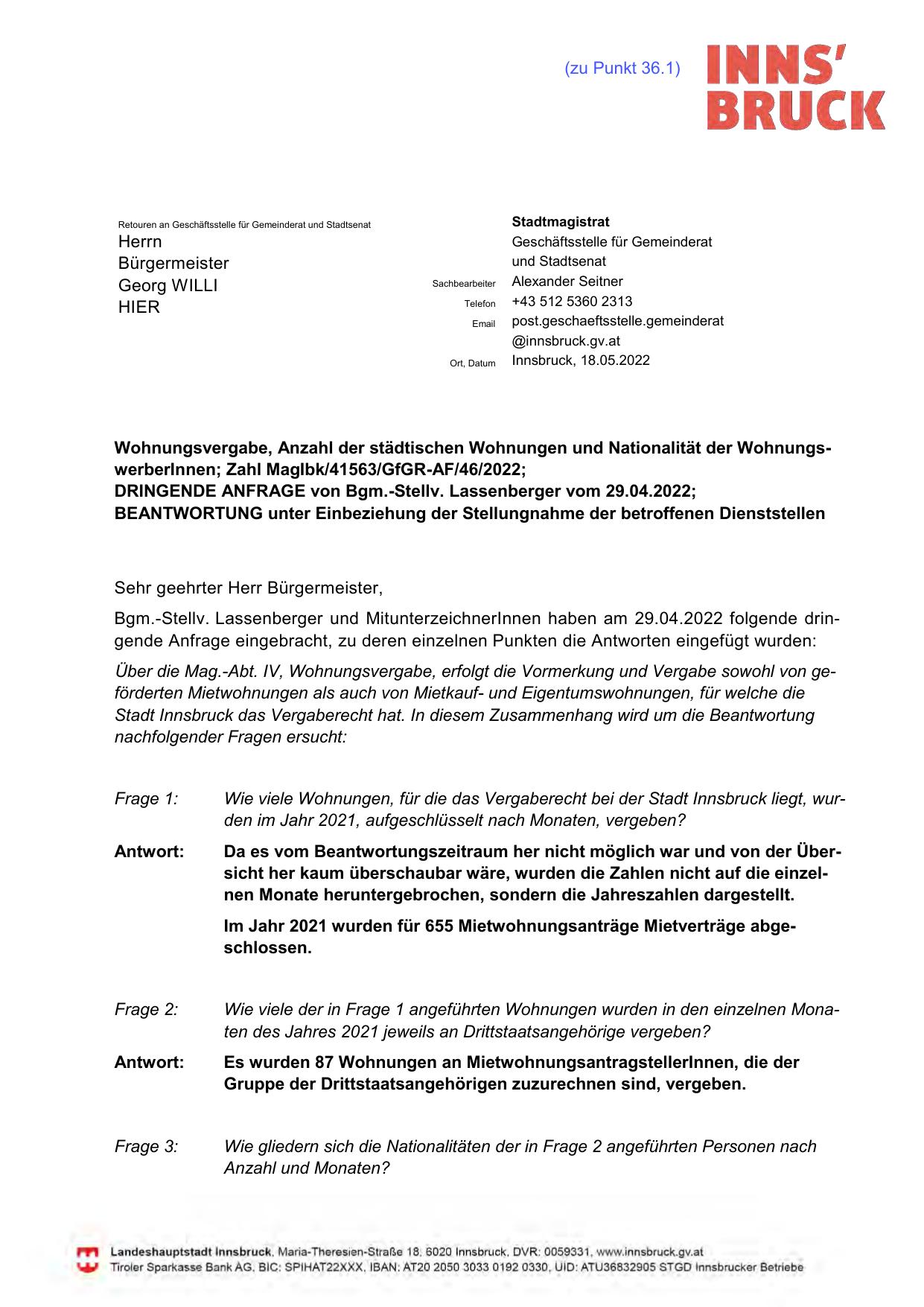 Wohnungsvergabe, Anzahl der städtischen Wohnungen und Nationalität der WohnungswerberInnen; Zahl MagIbk/41563/GfGR-AF/46/2022;