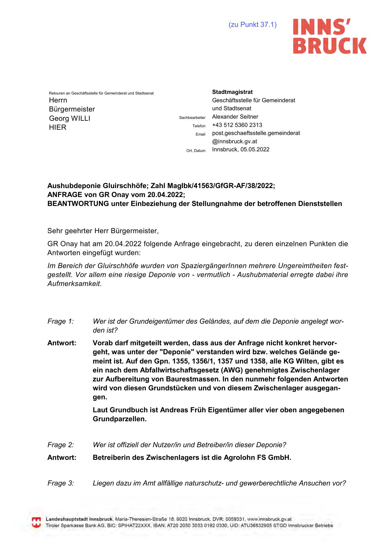 Vorab darf mitgeteilt werden, dass aus der Anfrage nicht konkret hervorgeht, was unter der "Deponie" verstanden wird bzw. welches Gelände gemeint ist. Auf den Gpn. 1355, 1356/1, 1357 und 1358, alle KG Wilten, gibt es