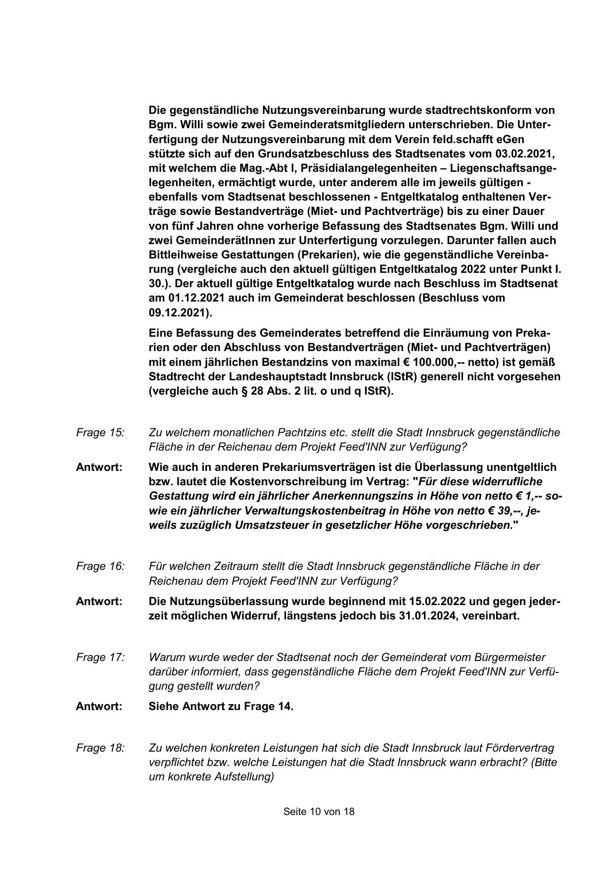 Zu welchem monatlichen Pachtzins etc. stellt die Stadt Innsbruck gegenständliche
