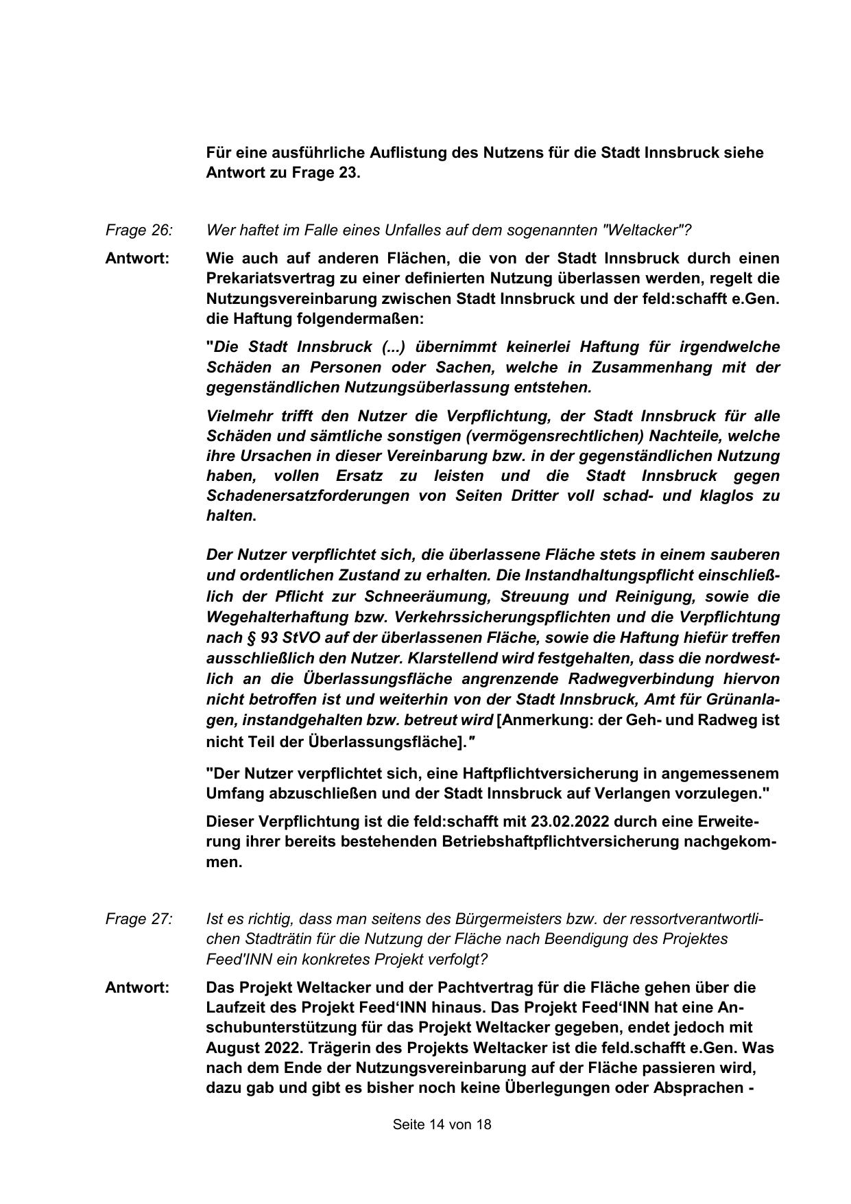 Nutzungsvereinbarung zwischen Stadt Innsbruck und der feld:schafft e.Gen.