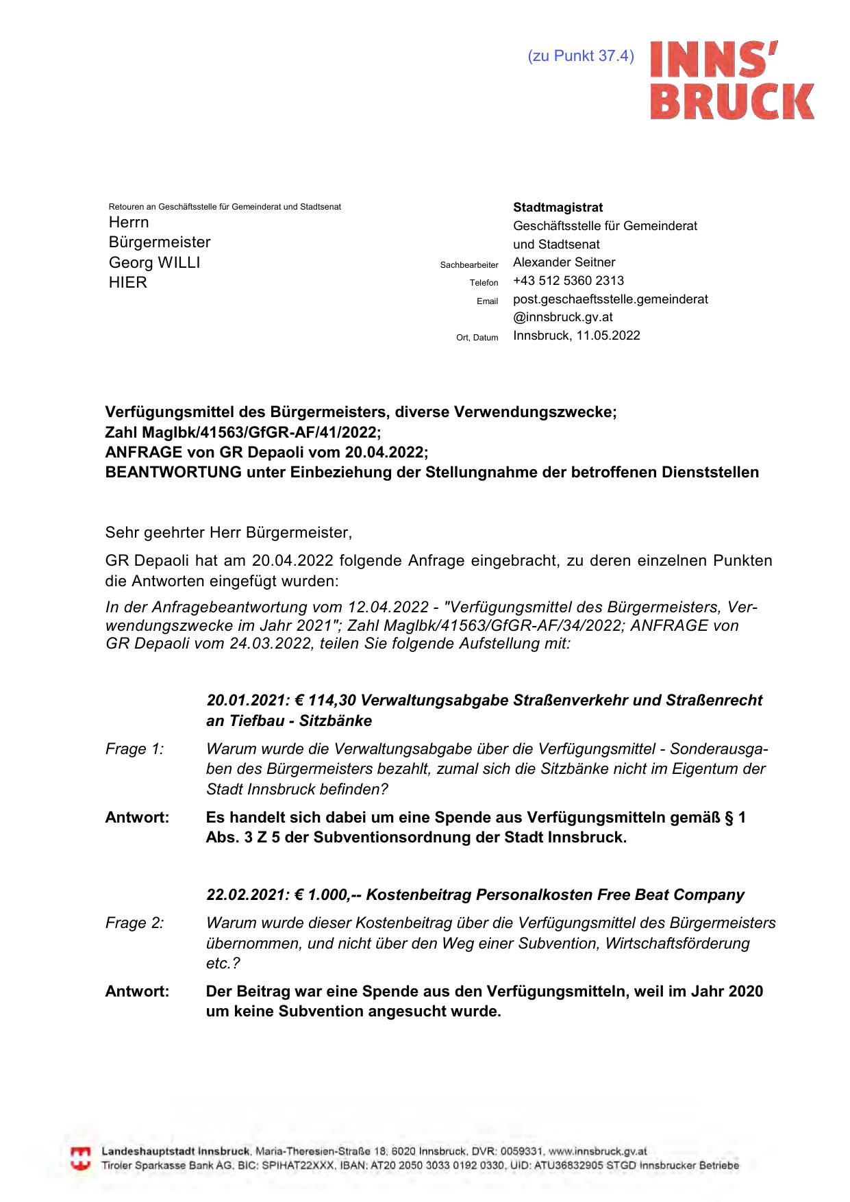 In der Anfragebeantwortung vom 12.04.2022 - "Verfügungsmittel des Bürgermeisters, Verwendungszwecke im Jahr 2021"; Zahl Maglbk/41563/GfGR-AF/34/2022; ANFRAGE von