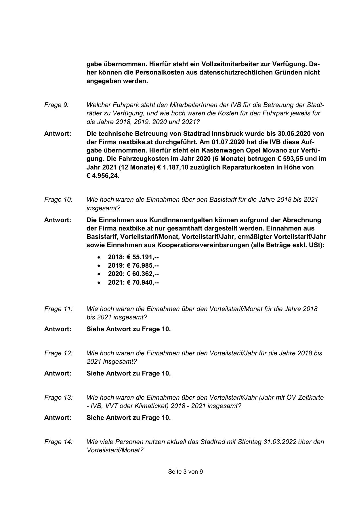 der Firma nextbike.at durchgeführt. Am 01.07.2020 hat die IVB diese Aufgabe übernommen. Hierfür steht ein Kastenwagen Opel Movano zur Verfügung. Die Fahrzeugkosten im Jahr 2020 (6 Monate) betrugen € 593,55 und im
