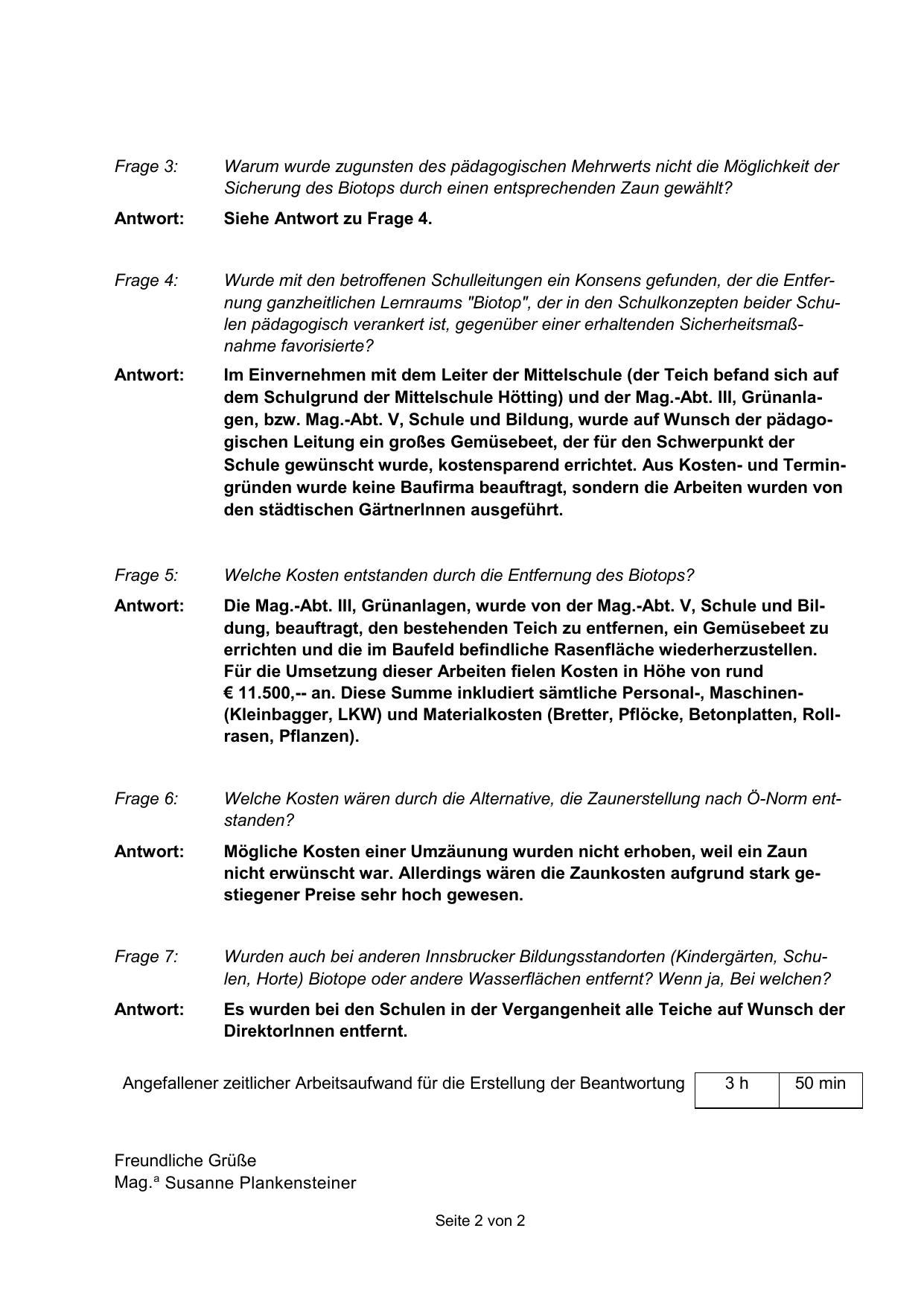 Wurden auch bei anderen Innsbrucker Bildungsstandorten (Kindergärten, Schulen, Horte) Biotope oder andere Wasserflächen entfernt? Wenn ja, Bei welchen?