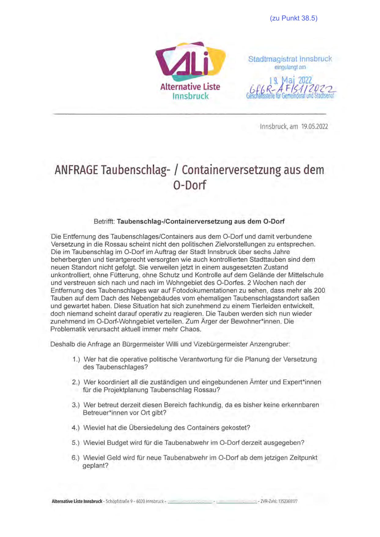 ANFRAGE Taubenschlag- / Containerversetzung aus dem