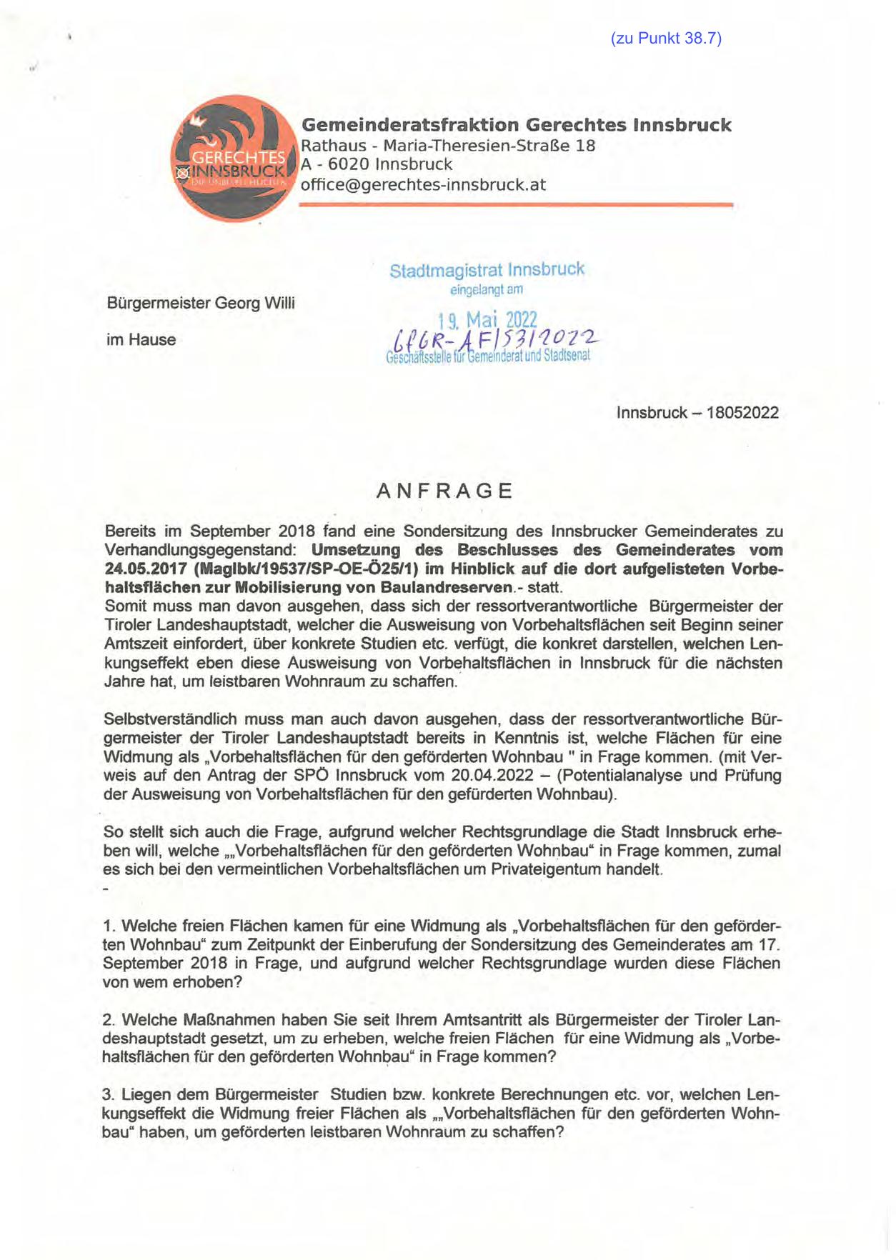 Widmung als „Vorbehaltsflächen für den geförderten Wohnbau"" in Frage kommen. (mit Verweis auf den Antrag der SPO Innsbruck vom 20.04.2022 - (Potentialanalyse und Prüfung
