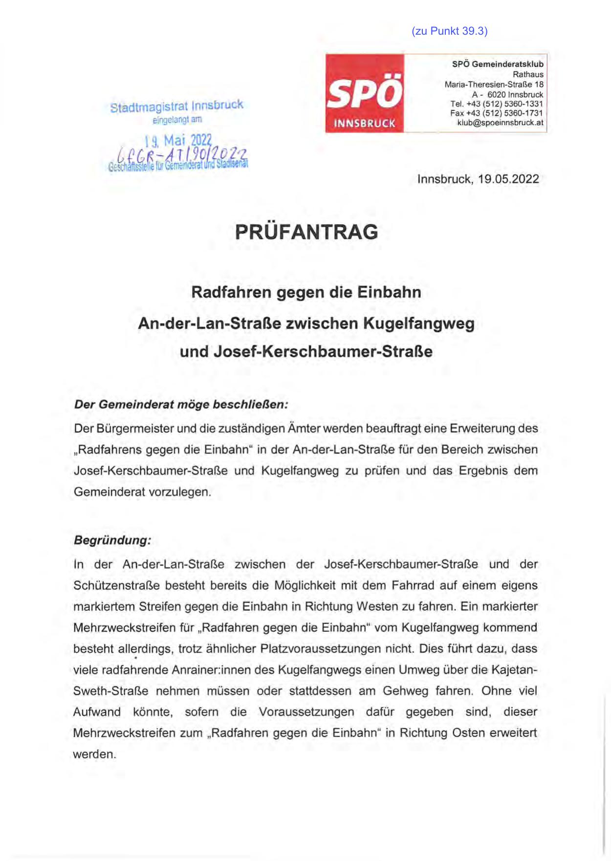 Josef-Kerschbaumer-Straße und Kugelfangweg zu prüfen und das Ergebnis dem