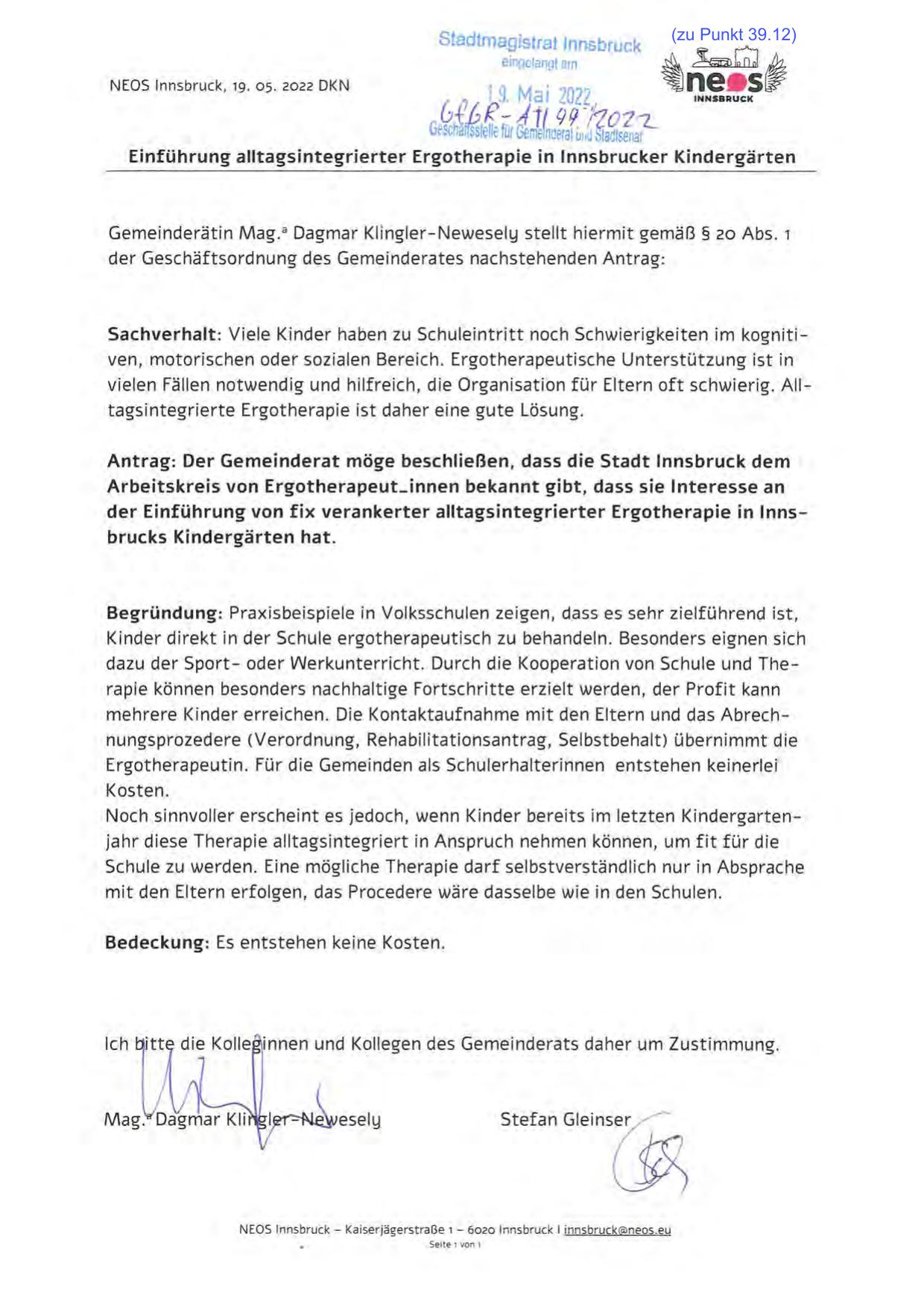 Antrag: Der Gemeinderat möge beschließen, dass die Stadt Innsbruck dem