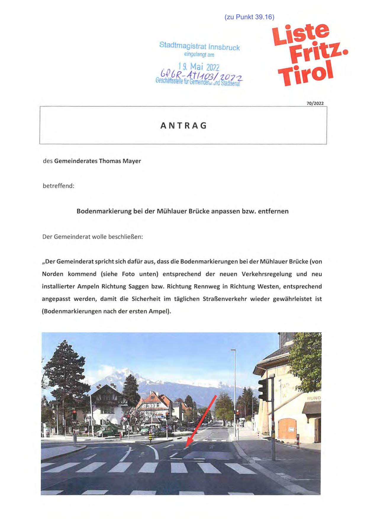 „Der Gemeinderat spricht sich dafür aus, dass die Bodenmarkierungen bei der Mühlauer Brücke (von