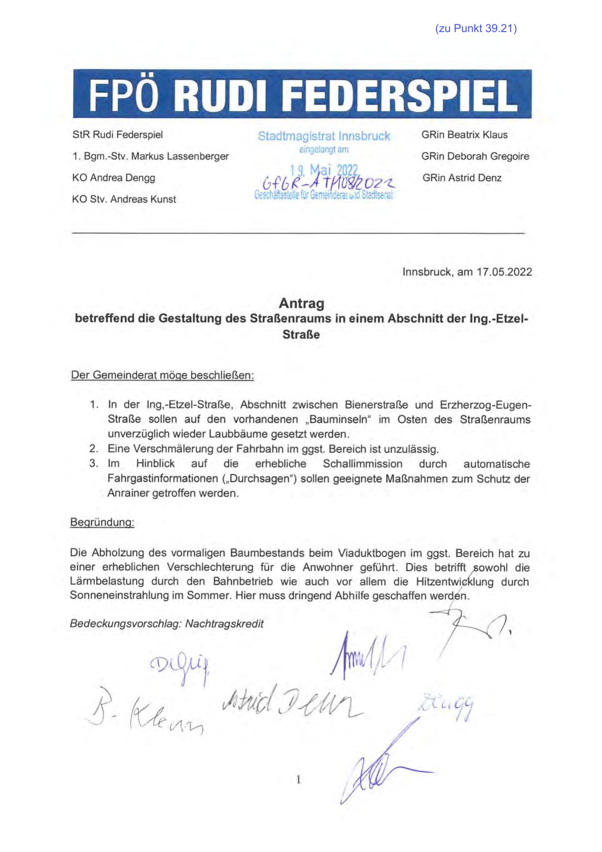 betreffend die Gestaltung des Straßenraums in einem Abschnitt der lng.-EtzelStraße